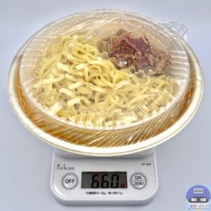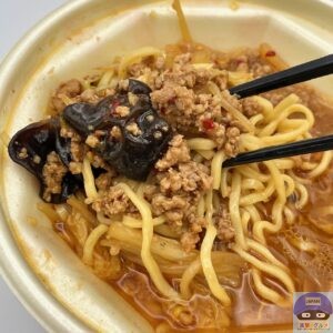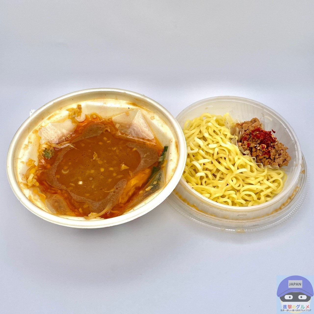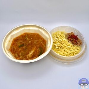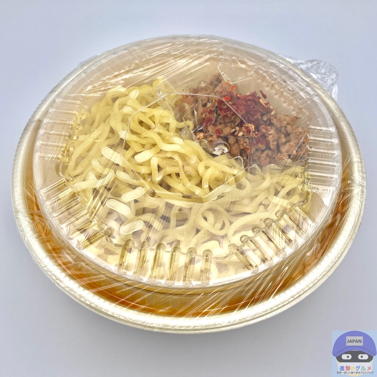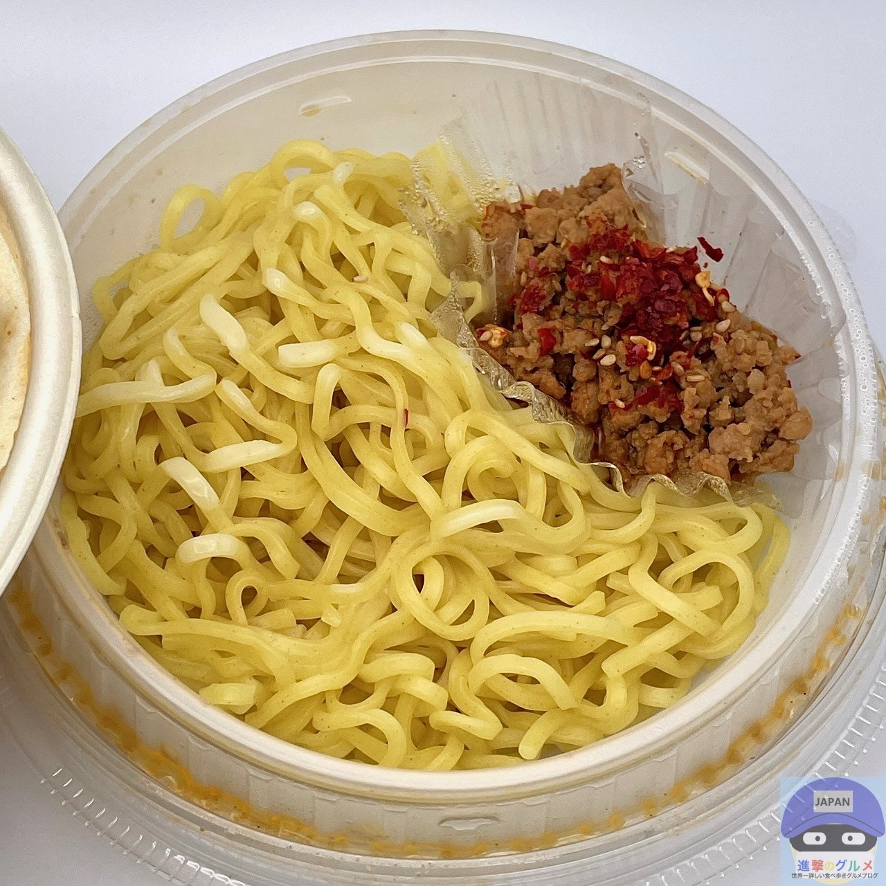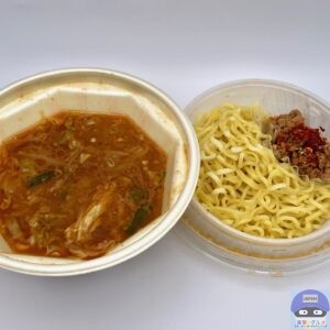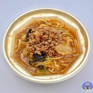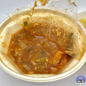 開封すると、麺、具材入りスープ、挽き肉が分かれています。