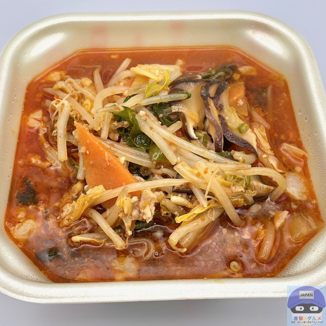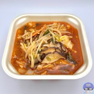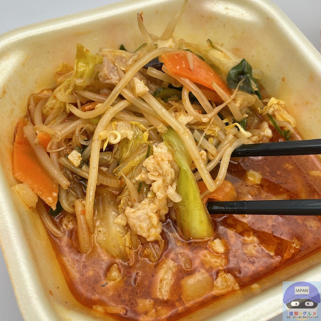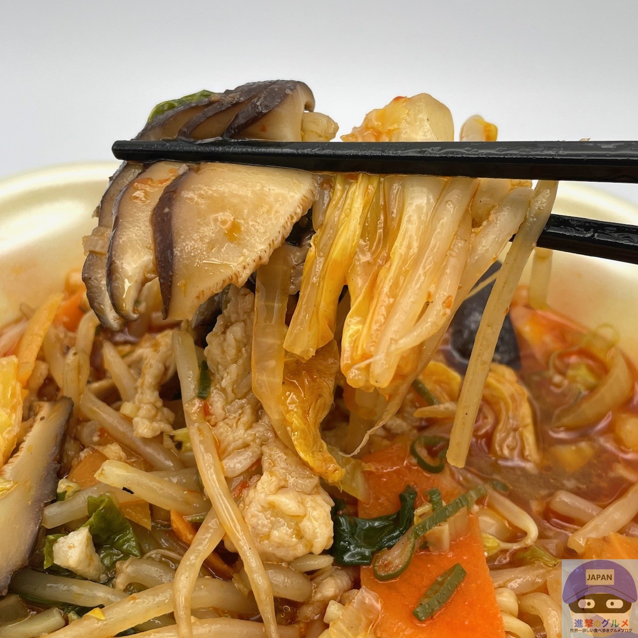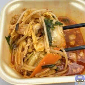 具材は、もやし・白菜・にんじん・玉ねぎ・ねぎ・チンゲン菜・椎茸・豚肉・背脂・生姜などが入っています。