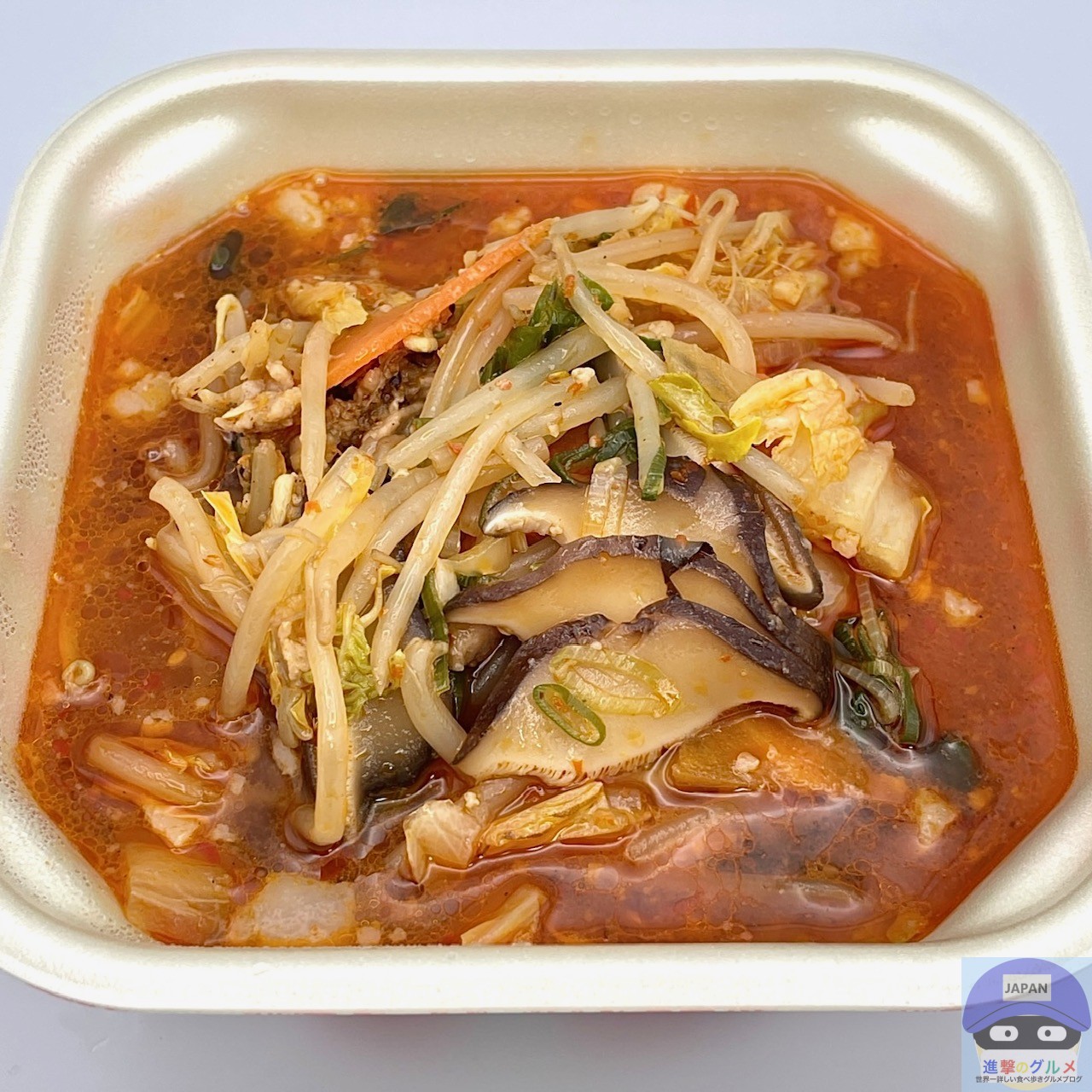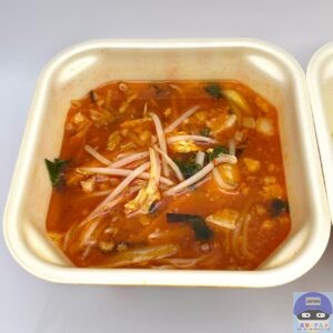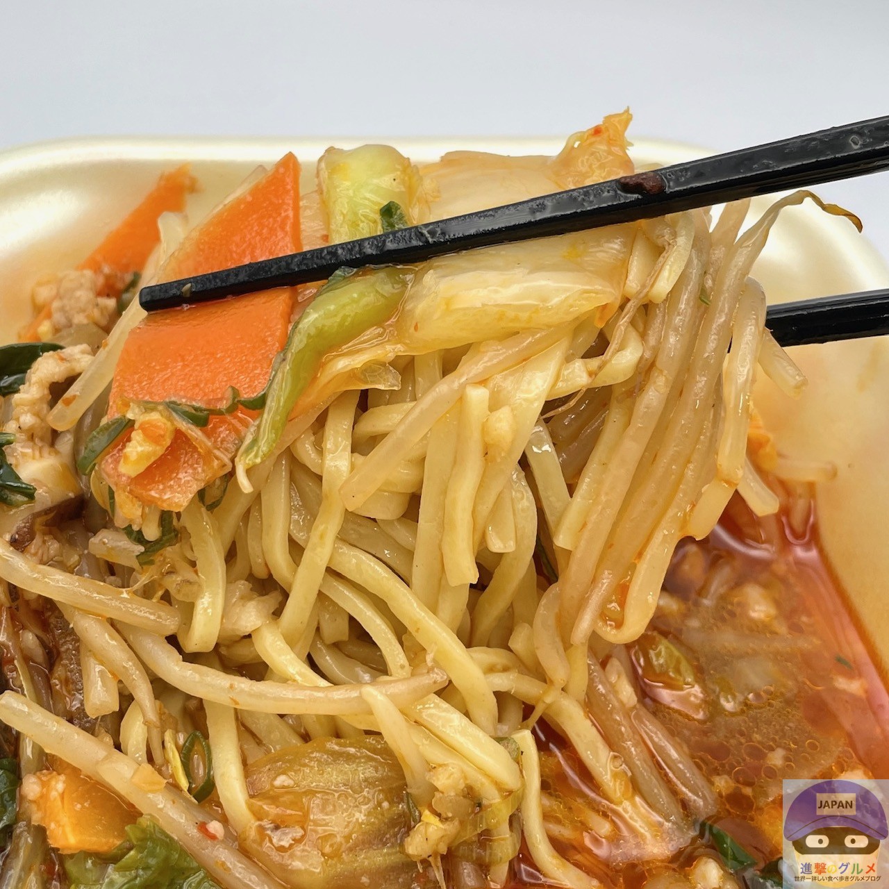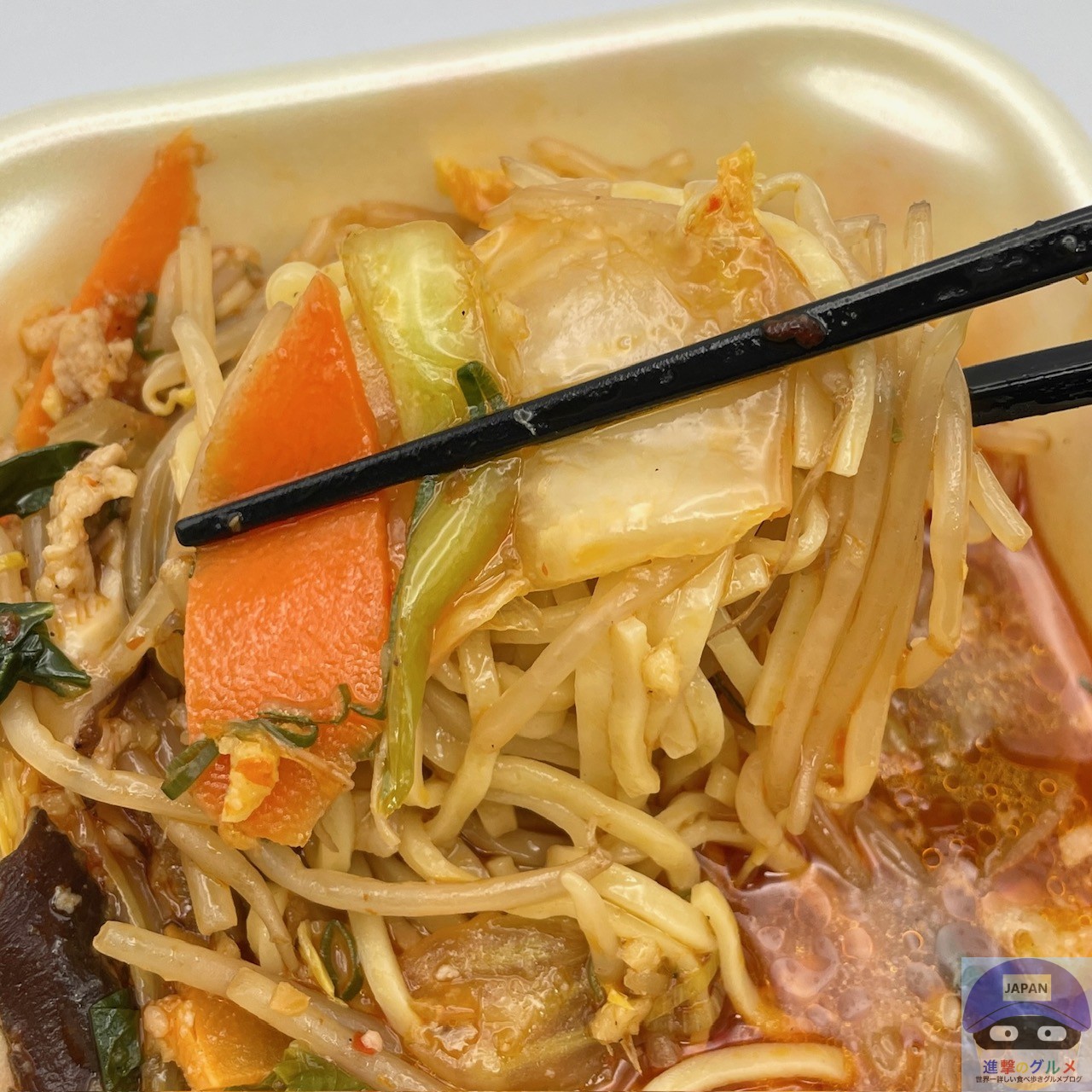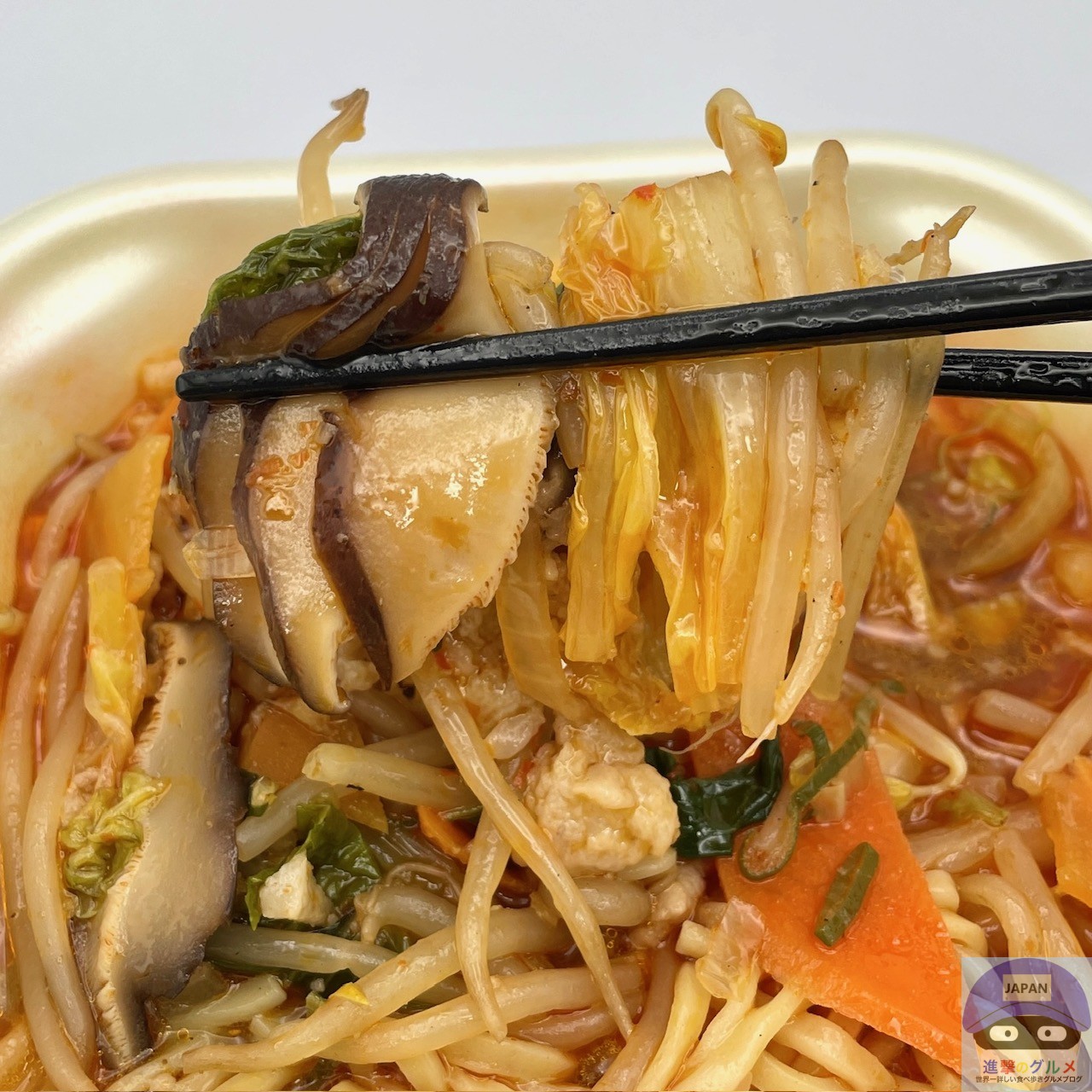 具材は、もやし・白菜・にんじん・玉ねぎ・ねぎ・チンゲン菜・椎茸・豚肉・背脂・生姜などが入っています。