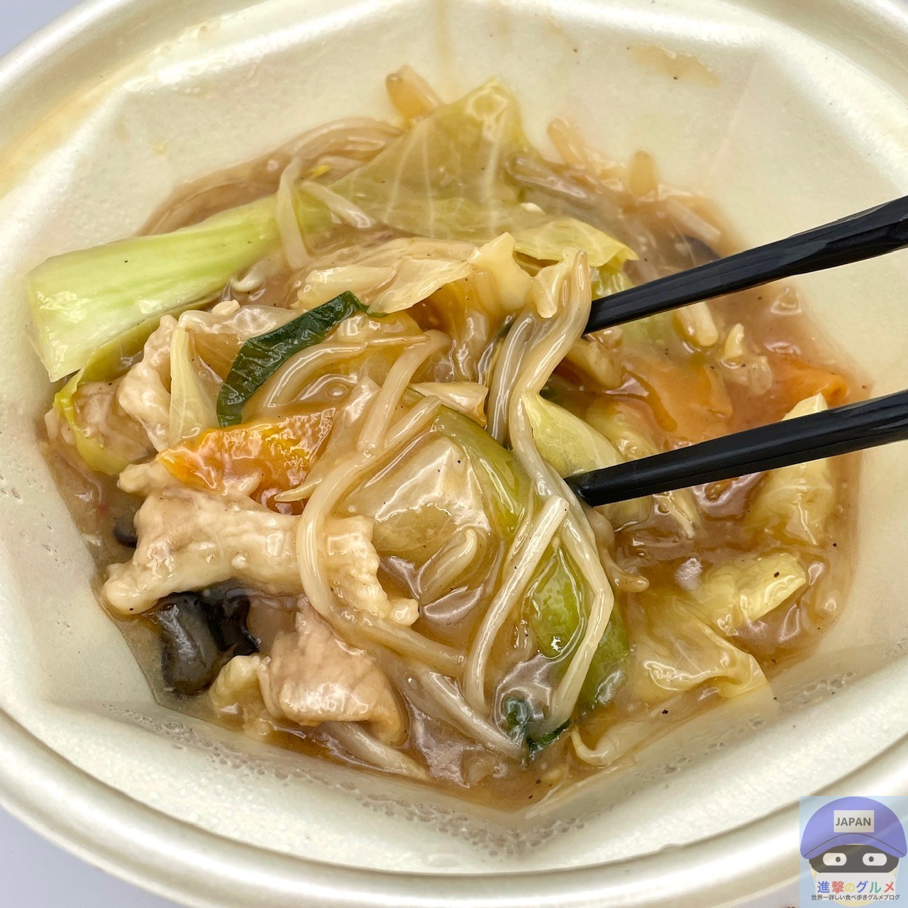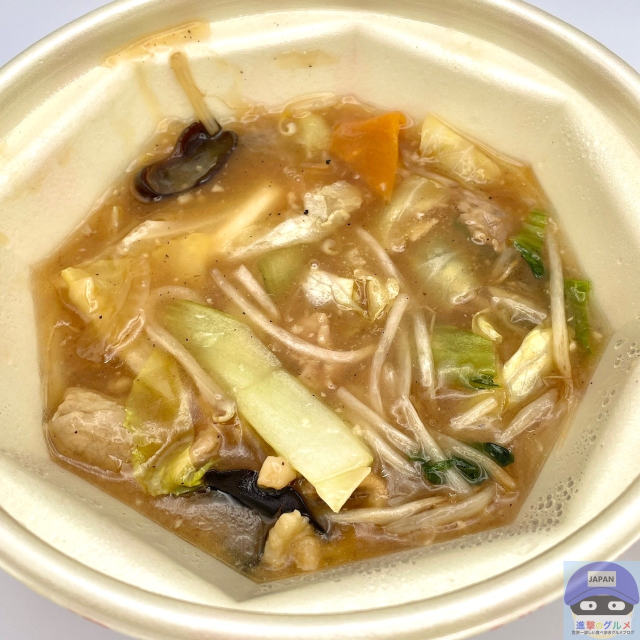 具材は、豚肉・キャベツ・にんじん・もやし・チンゲン菜・きくらげなどが入っています。