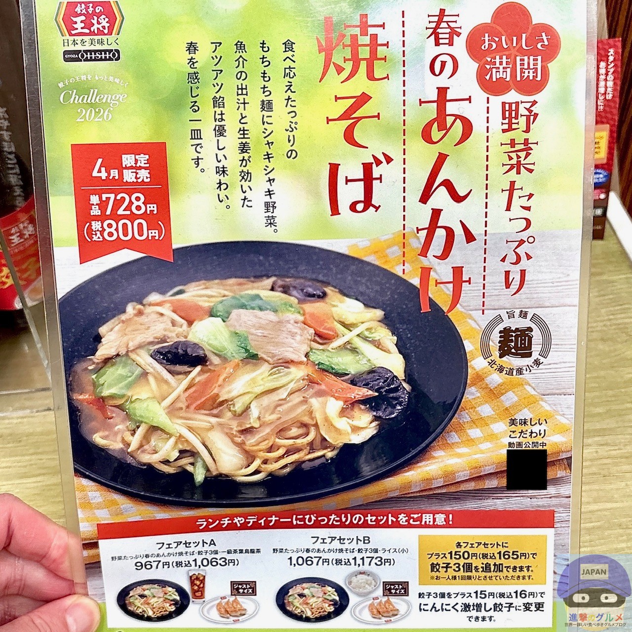 今回は、月替わりメニュー(2026年4月)、”餃子に絶対の自信あり。”厳選食材を使用したこだわりの本格中華が食べられる有名人気チェーン「餃子の王将」へ進撃しました。