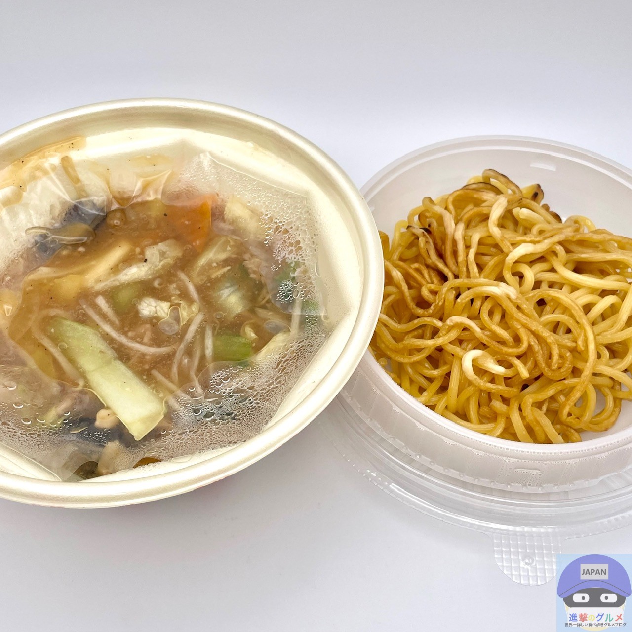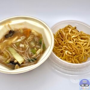 開封すると、北海道産小麦粉を使用した中太麺、具材入り餡が分かれています。