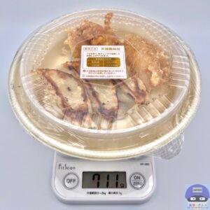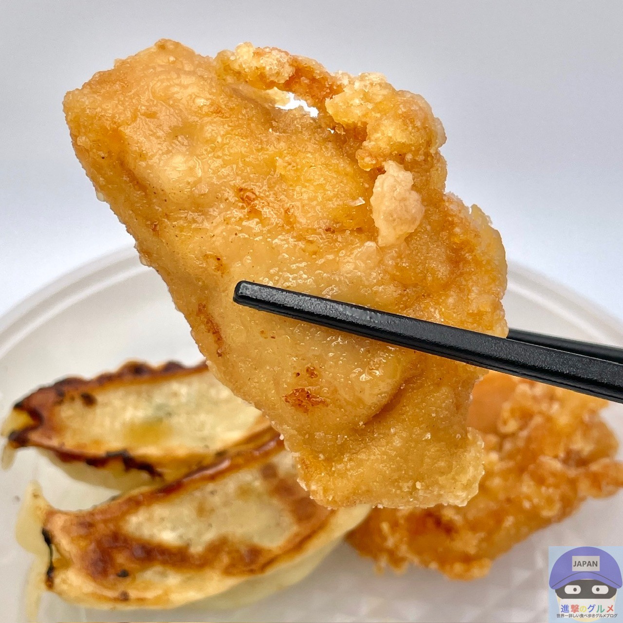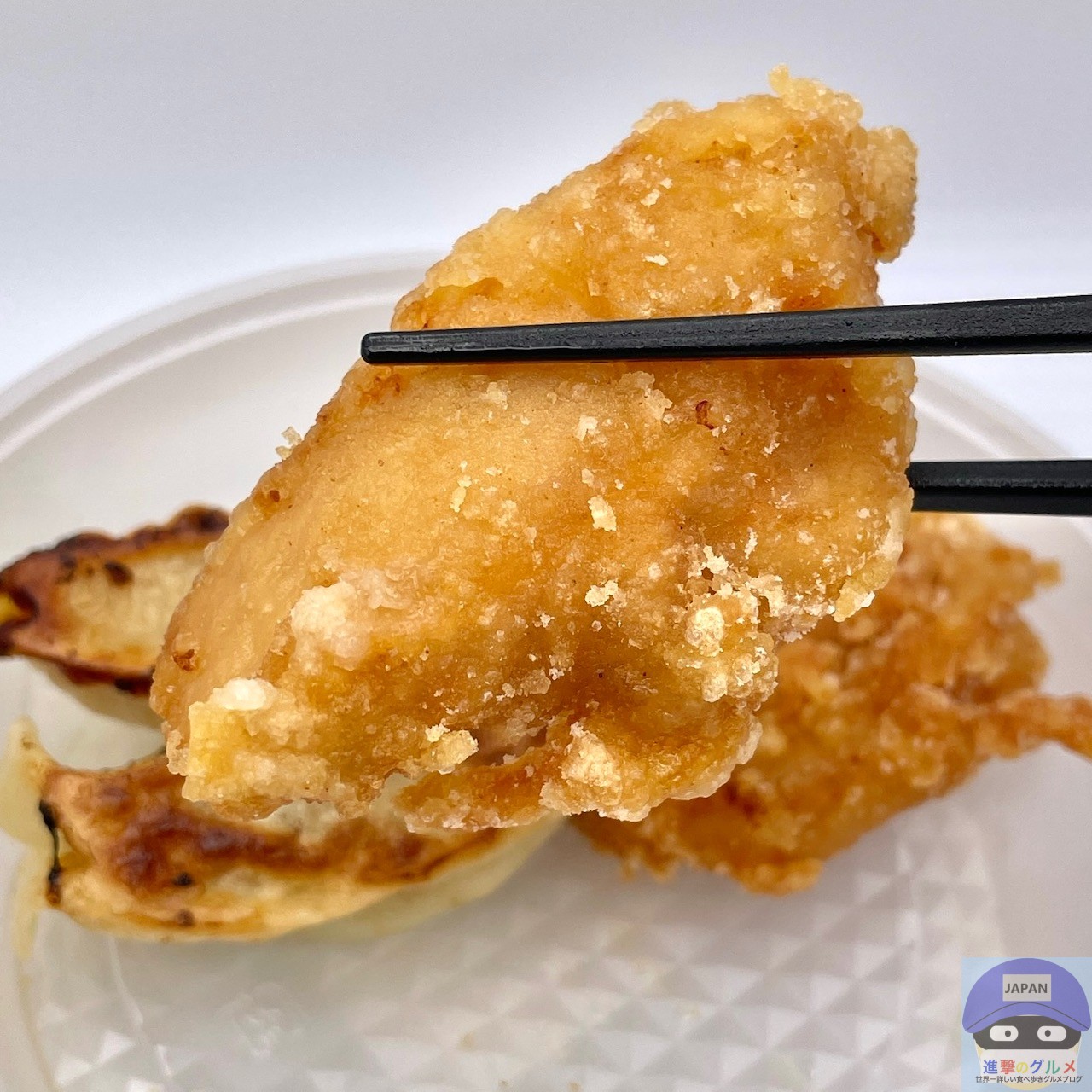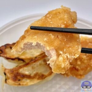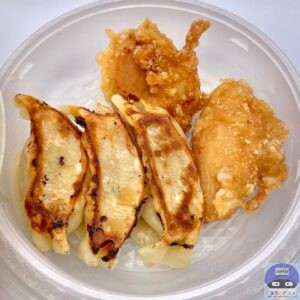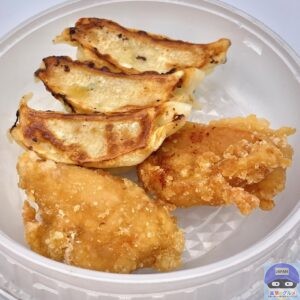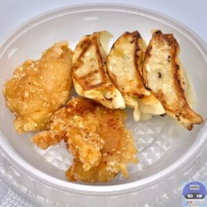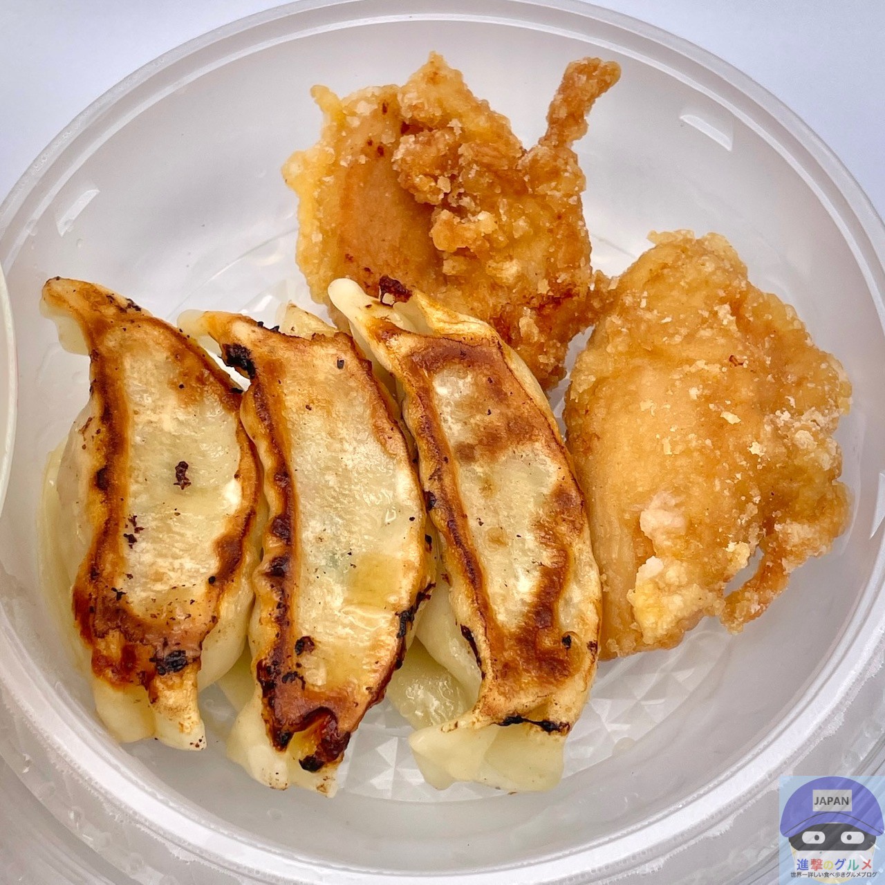 シンプルな見た目、餃子3個と鶏の唐揚げ2個の組み合わせです。