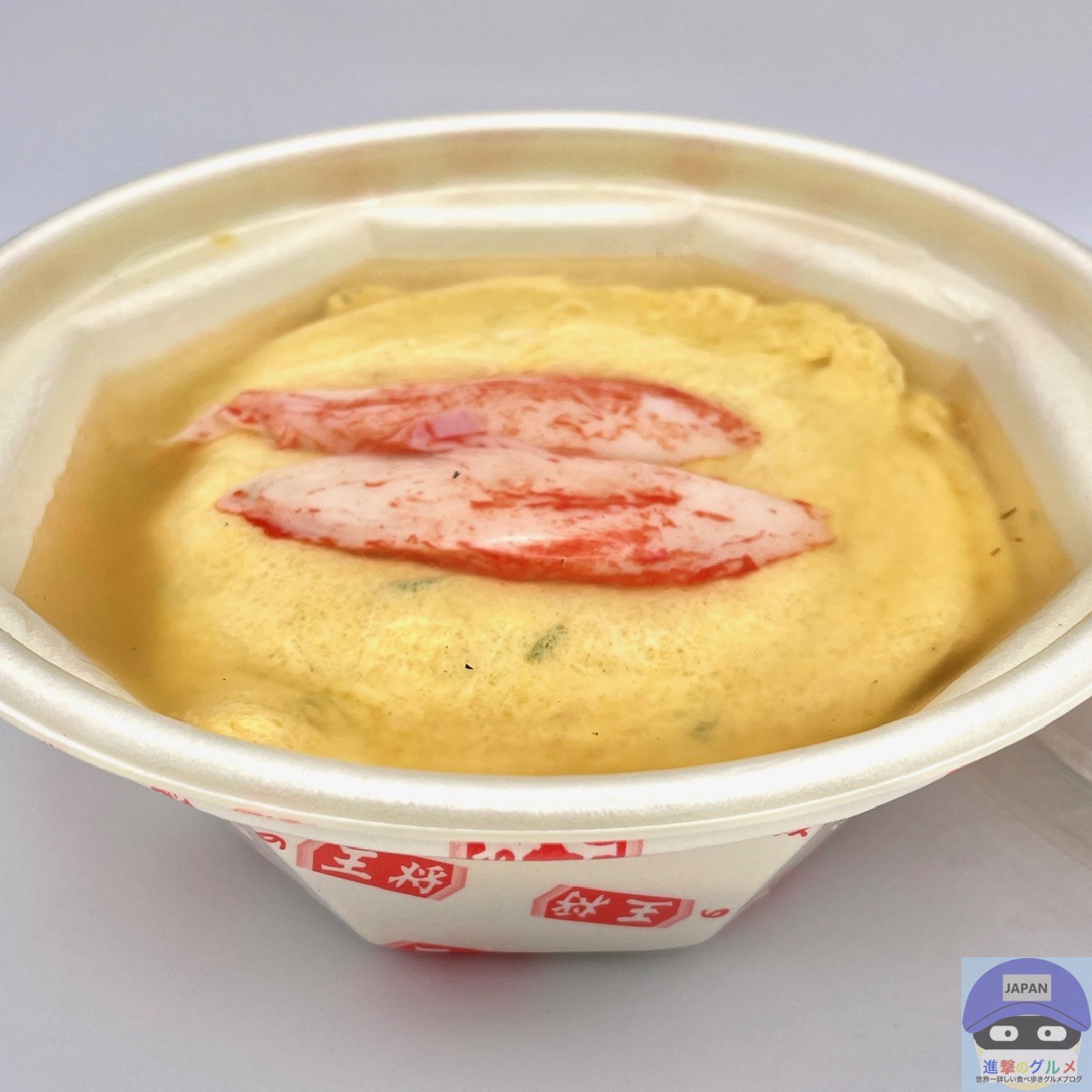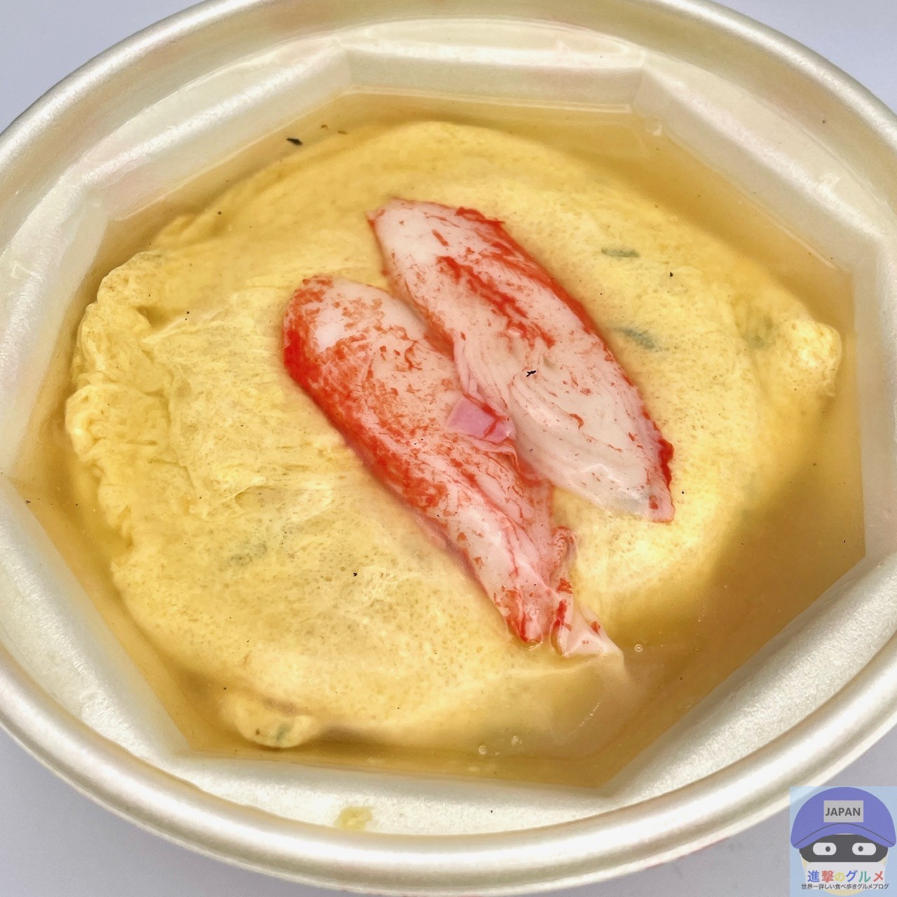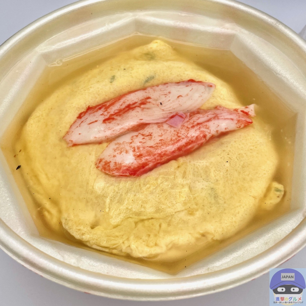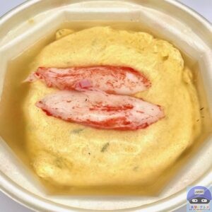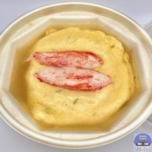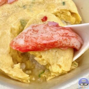 ねぎ入りのふわとろ玉子でご飯を覆い、カニ風味かまぼこと塩ダレをトッピングしています。