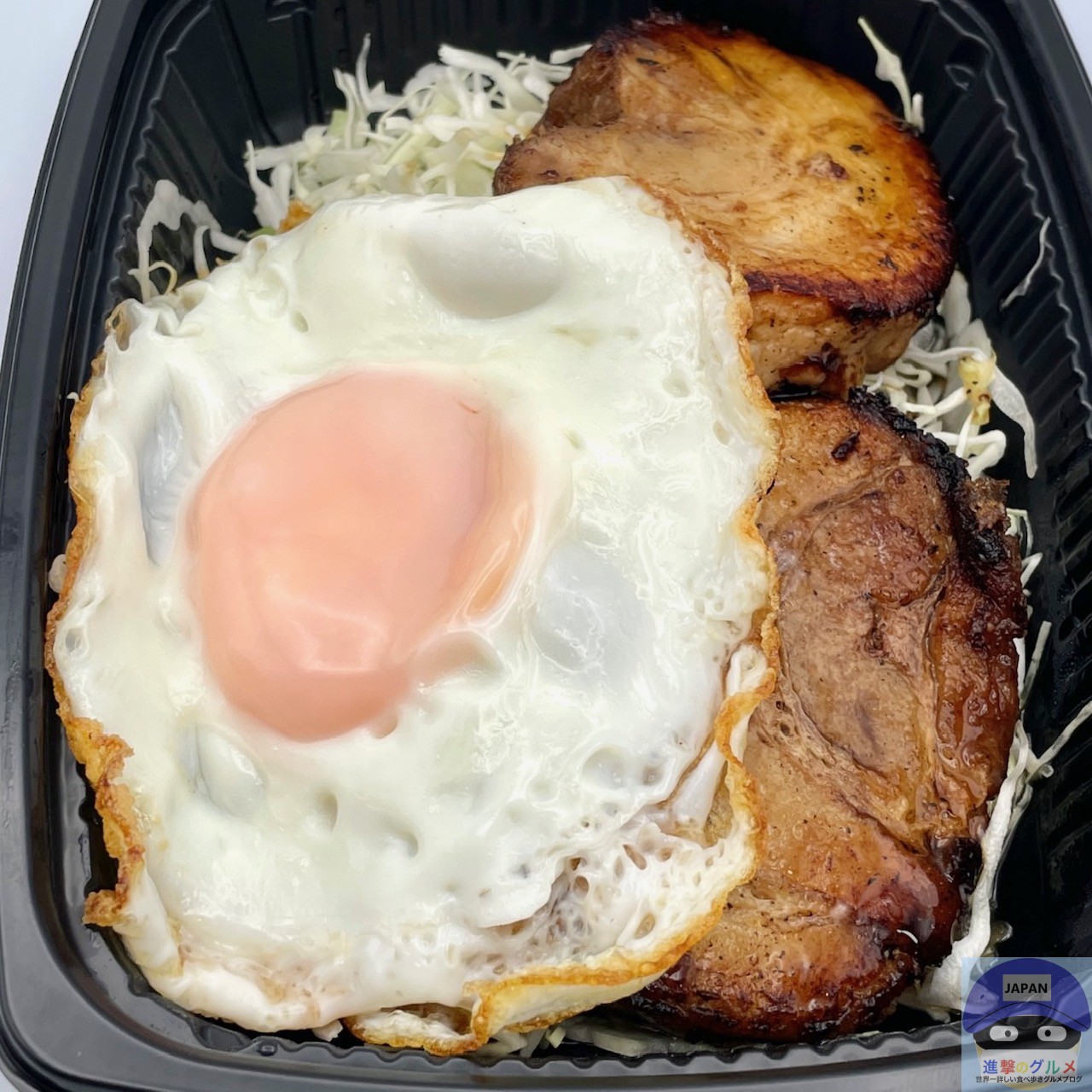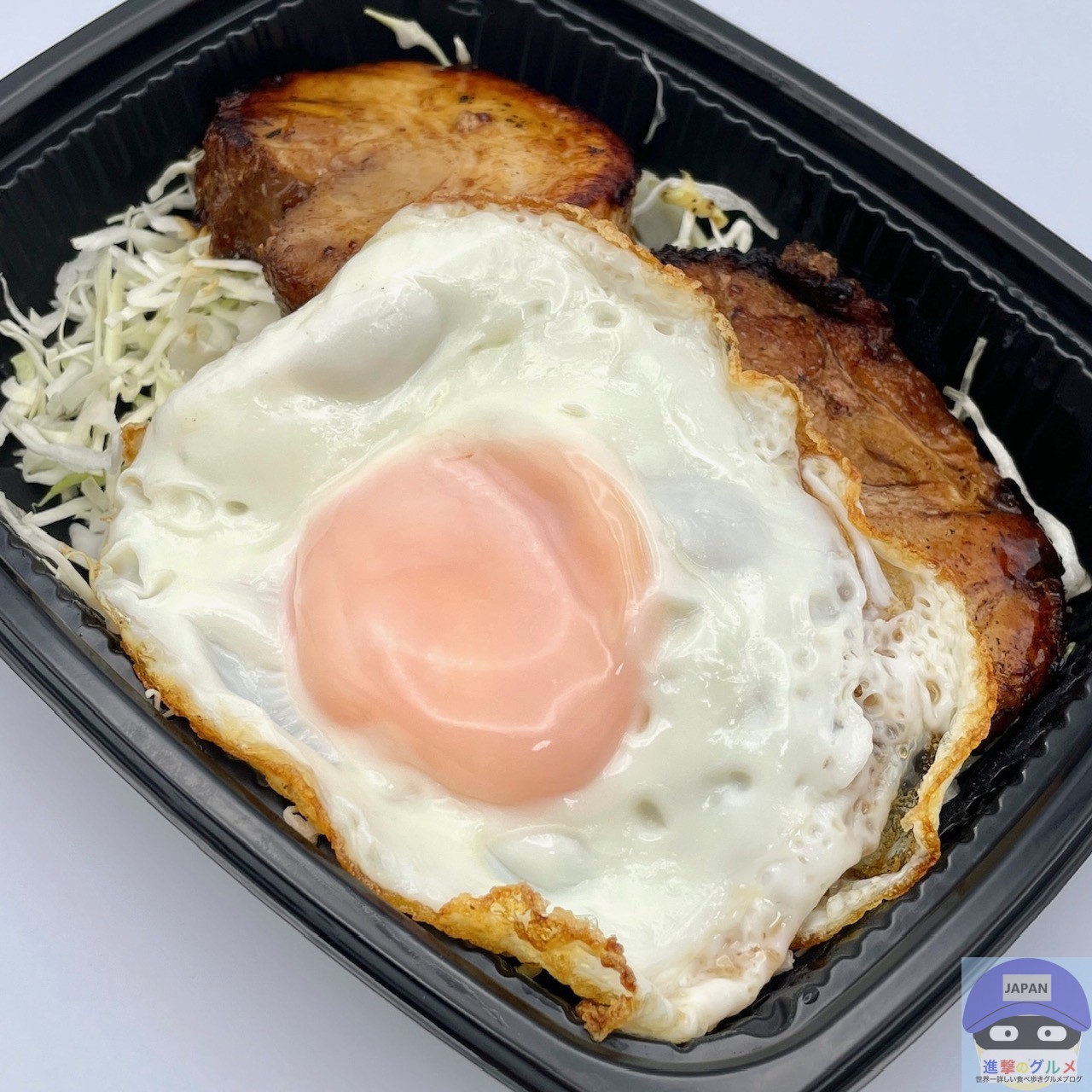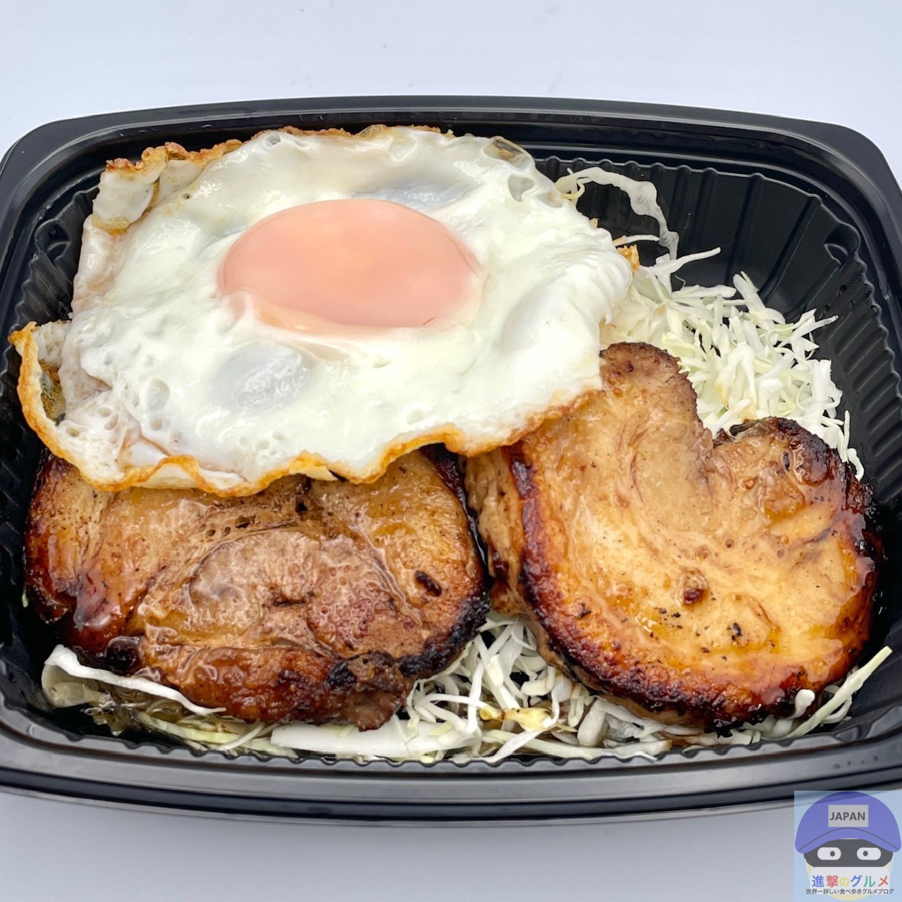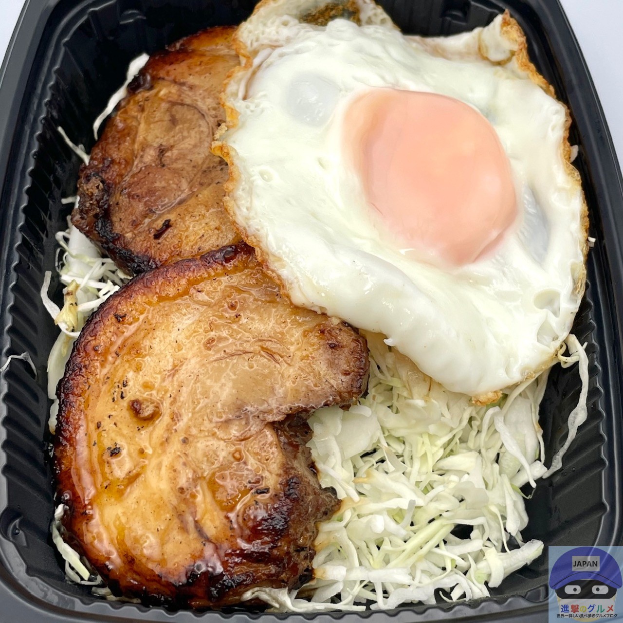 厚みのある巻きチャーシュー2枚、甘辛ダレ、目玉焼き、キャベツの組み合わせです。