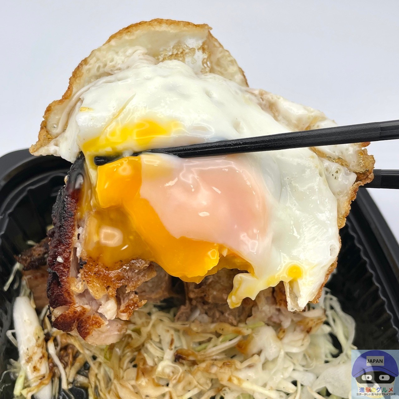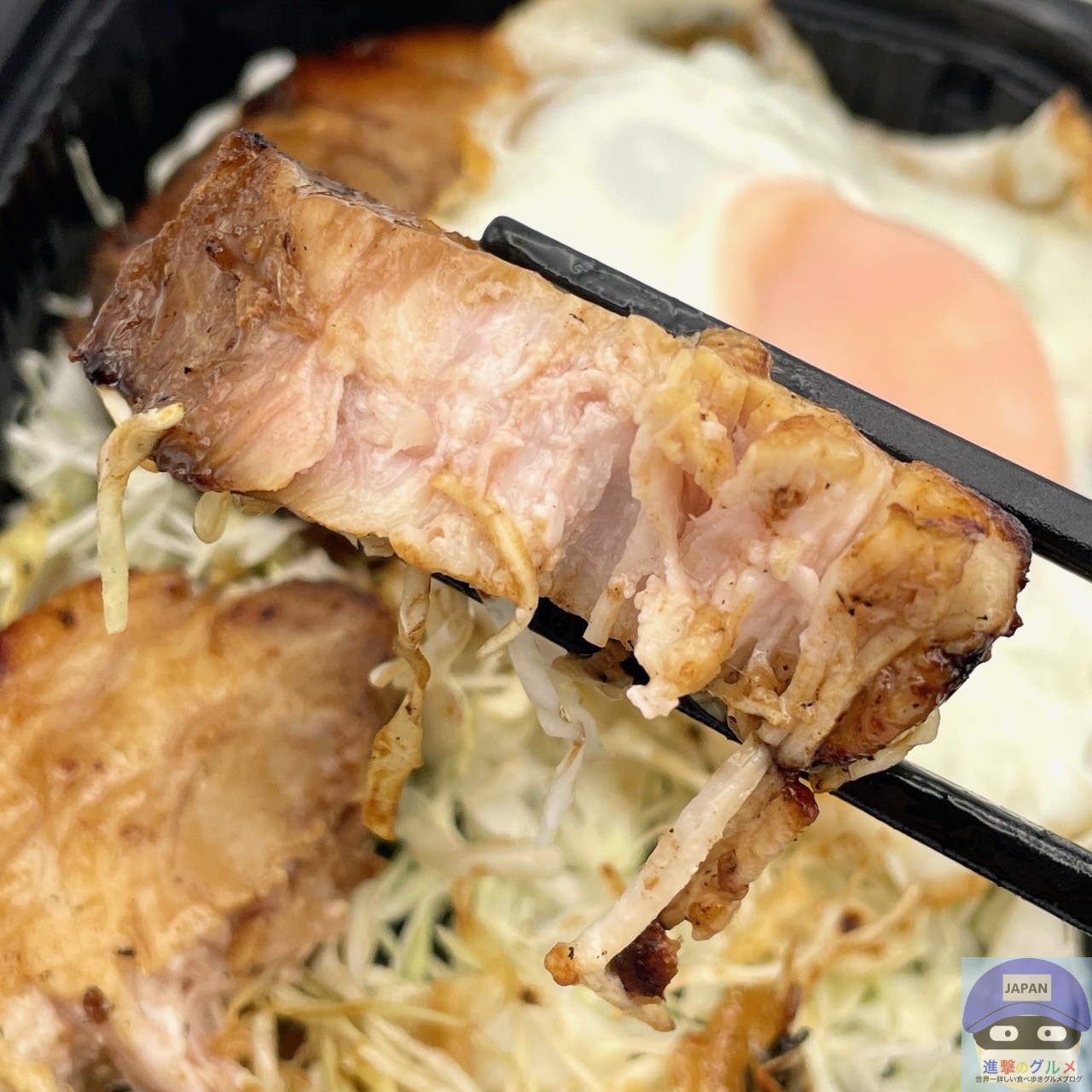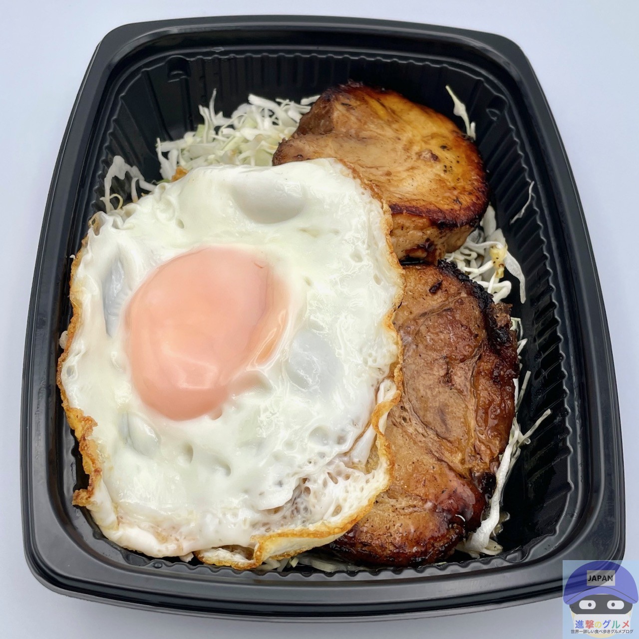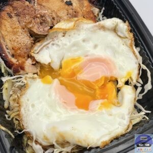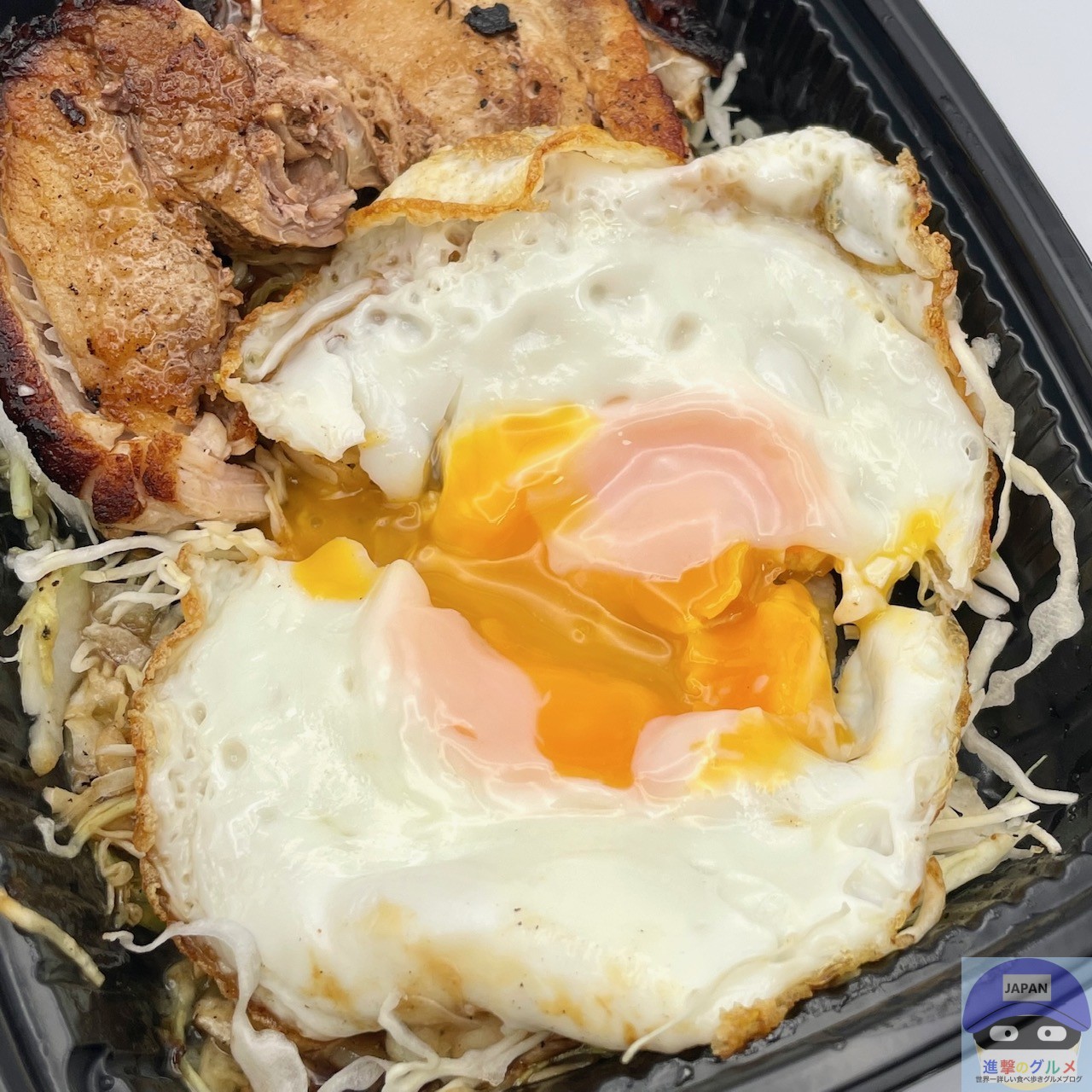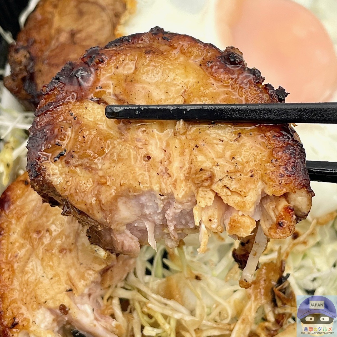 厚みのある巻きチャーシュー2枚、甘辛ダレ、目玉焼き、キャベツの組み合わせです。