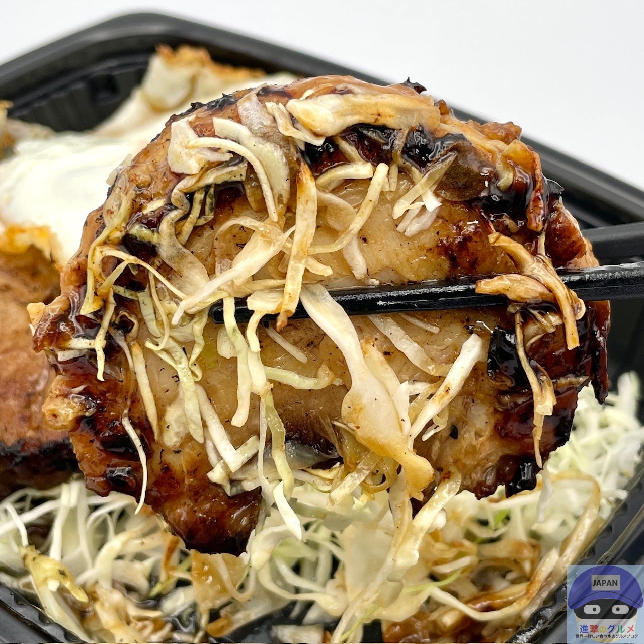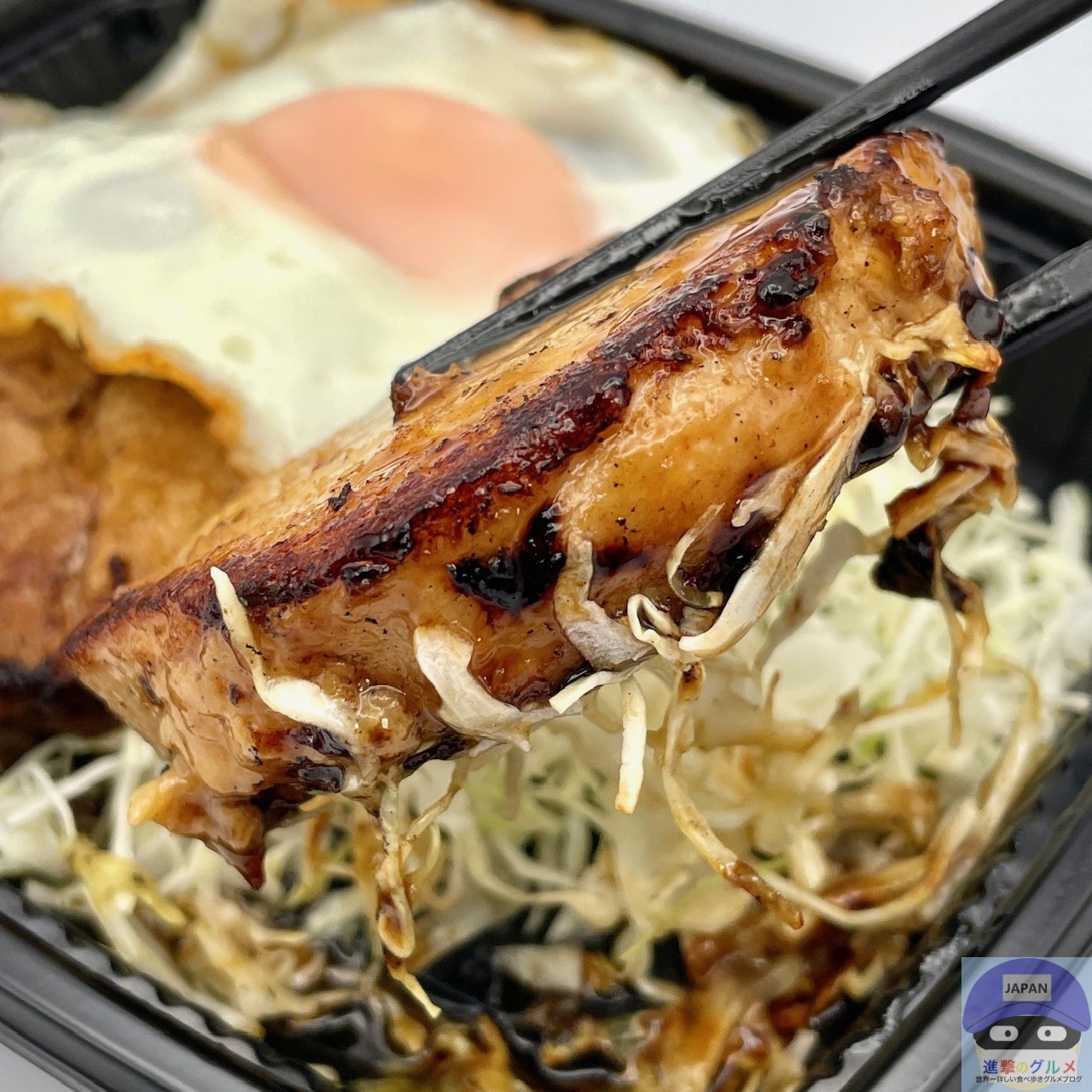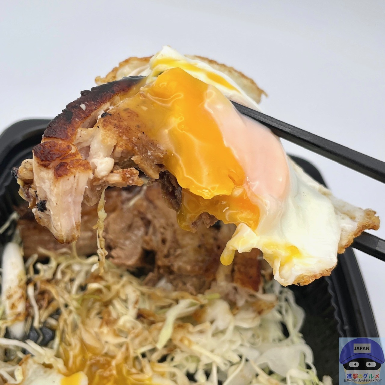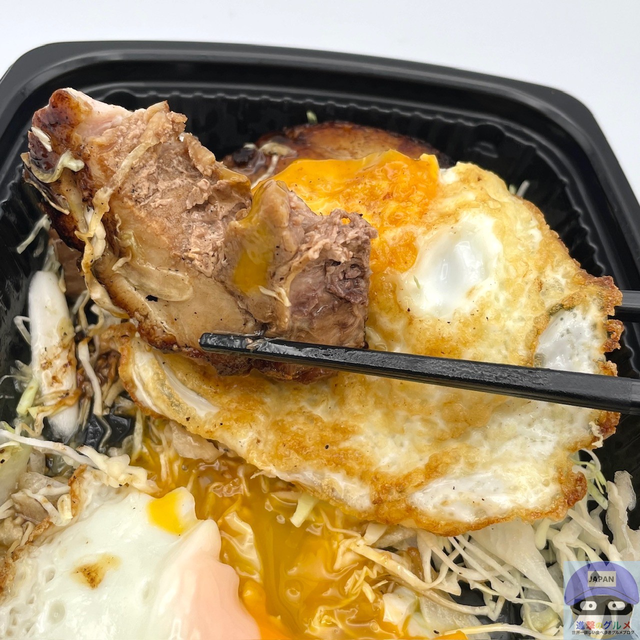 厚みのある巻きチャーシュー2枚、甘辛ダレ、目玉焼き、キャベツの組み合わせです。