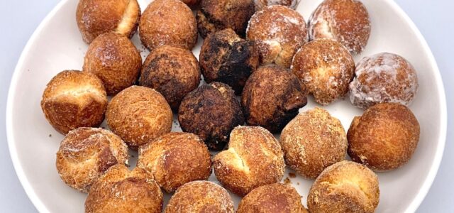 餃子・冷凍餃子の皮の端切れを主原料にしたドーナツ、餃子の皮から生まれた新スイーツです。
