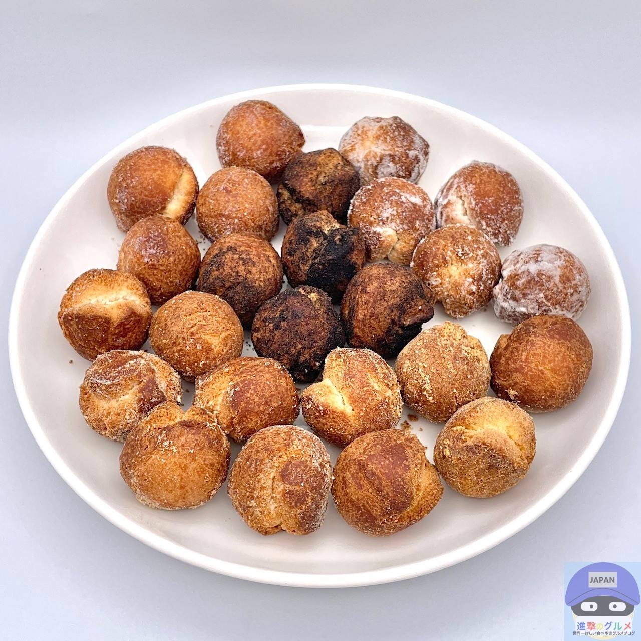 開封すると、揚げたてのひとくちドーナツにそれぞれパウダーがかかっています。