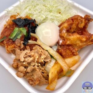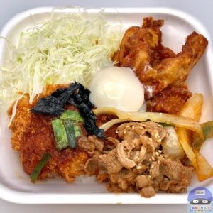 「プルコギ」「ヤンニョム風鶏から揚げ」「ロースカツ」を合わせた、見た目も味わいもインパクトのある、ボリューム満点の一品です。