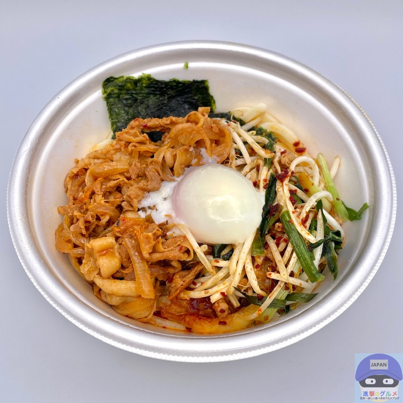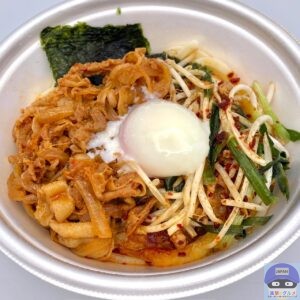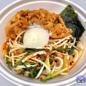 豚肉と玉ねぎの旨辛炒め、注文ごとに素揚げする肉そぼろ入りのシャキシャキ食感のニラともやし、濃厚な卵黄、海苔、刻みニンニク、8種の豊富な具材と打ち立てのうどんを、ニンニク香る旨辛ぶっかけだしがまとめた一品です。