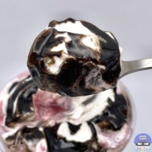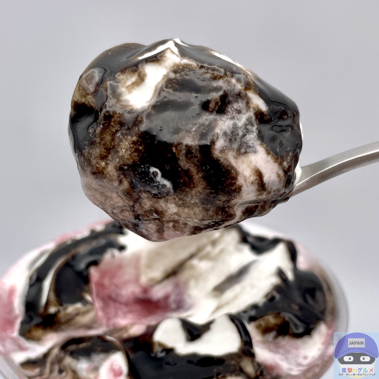 ひんやりして少しジューシー、アサイーベリーベースの甘酸っぱさ、チョコレートソースの甘みとビターなコクを感じます。