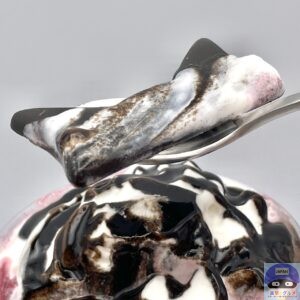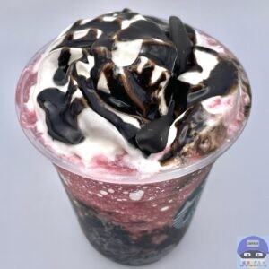 カップ全体を覆った真っ黒なチョコレートソースのカカオの深み、ビターで濃厚な味わいが、アサイーベリーベースのフレッシュな甘酸っぱさを引き立て、一口飲むごとに魔法のようなハーモニーを奏でます。
