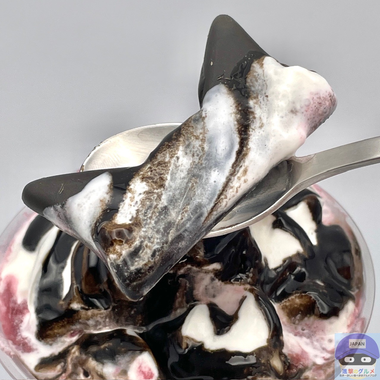 ふんわり軽やか、すっと溶けてさっぱり、チョコレートソースのカカオの風味、厚みのある猫耳チョコレートのカリカリ食感と甘みが良いです。