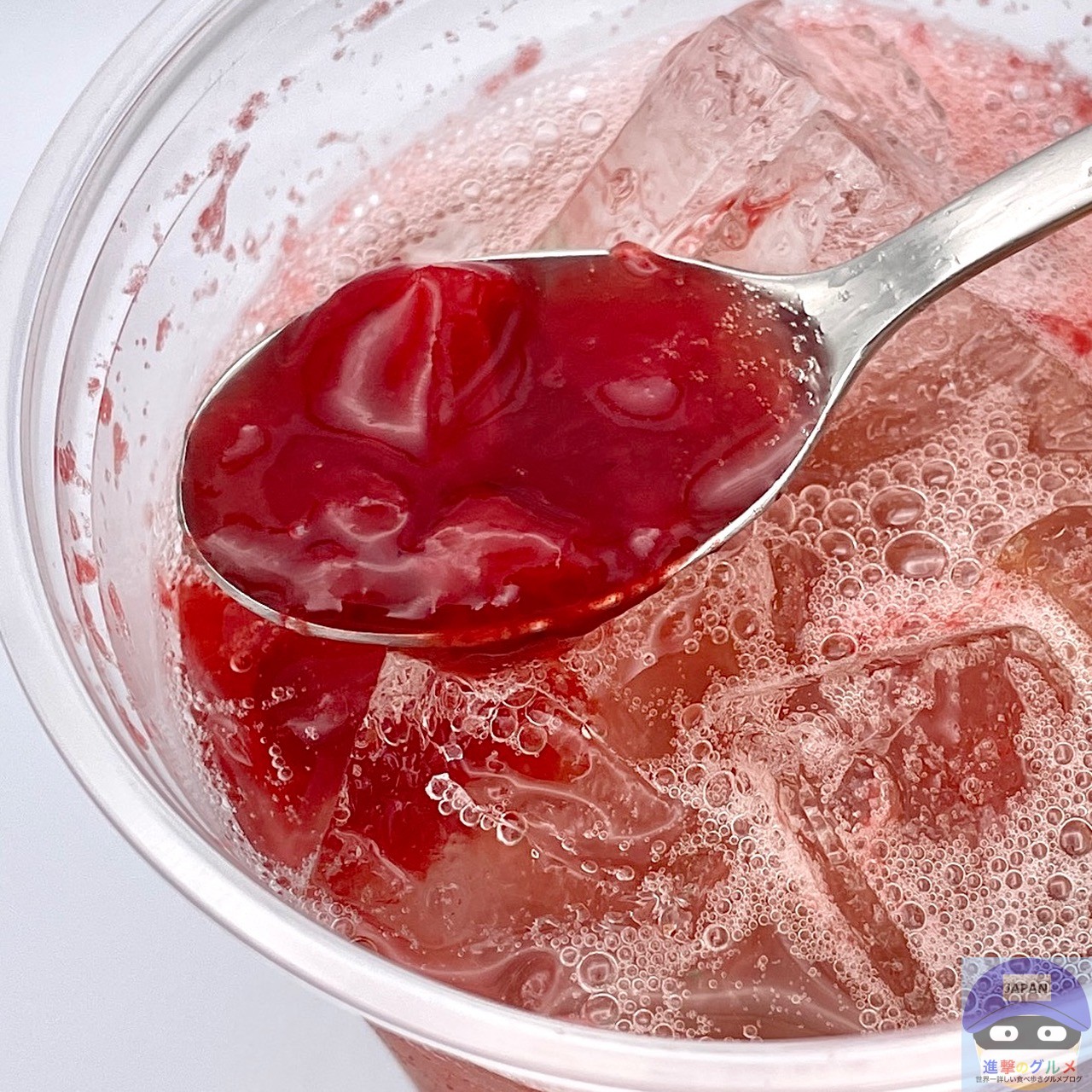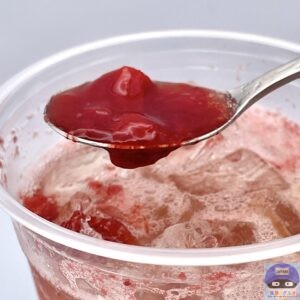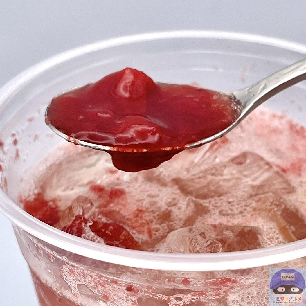 ストロベリー果肉ソースとジュレのつぶつぶ感と甘酸っぱさ、ジャムのような甘みが印象的、シュワッとすっきりした炭酸に、柑橘の酸味とシトラスの爽やかさを少し感じます。