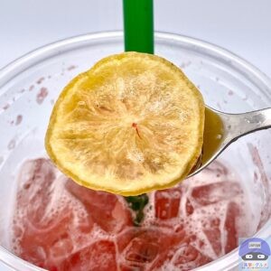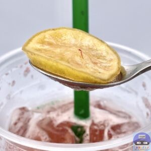 セミドライレモンスライスは、乾燥して硬めの食感、レモンの酸味や苦味は弱くて少し甘みがあり、レモンの味を楽しむよりもトッピングで見た目を良くしています。