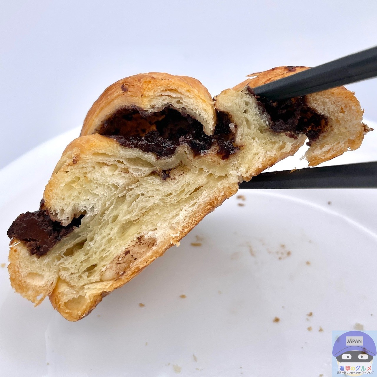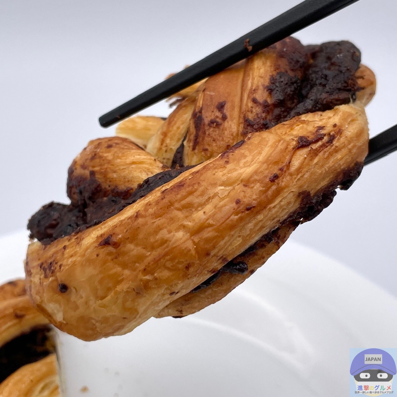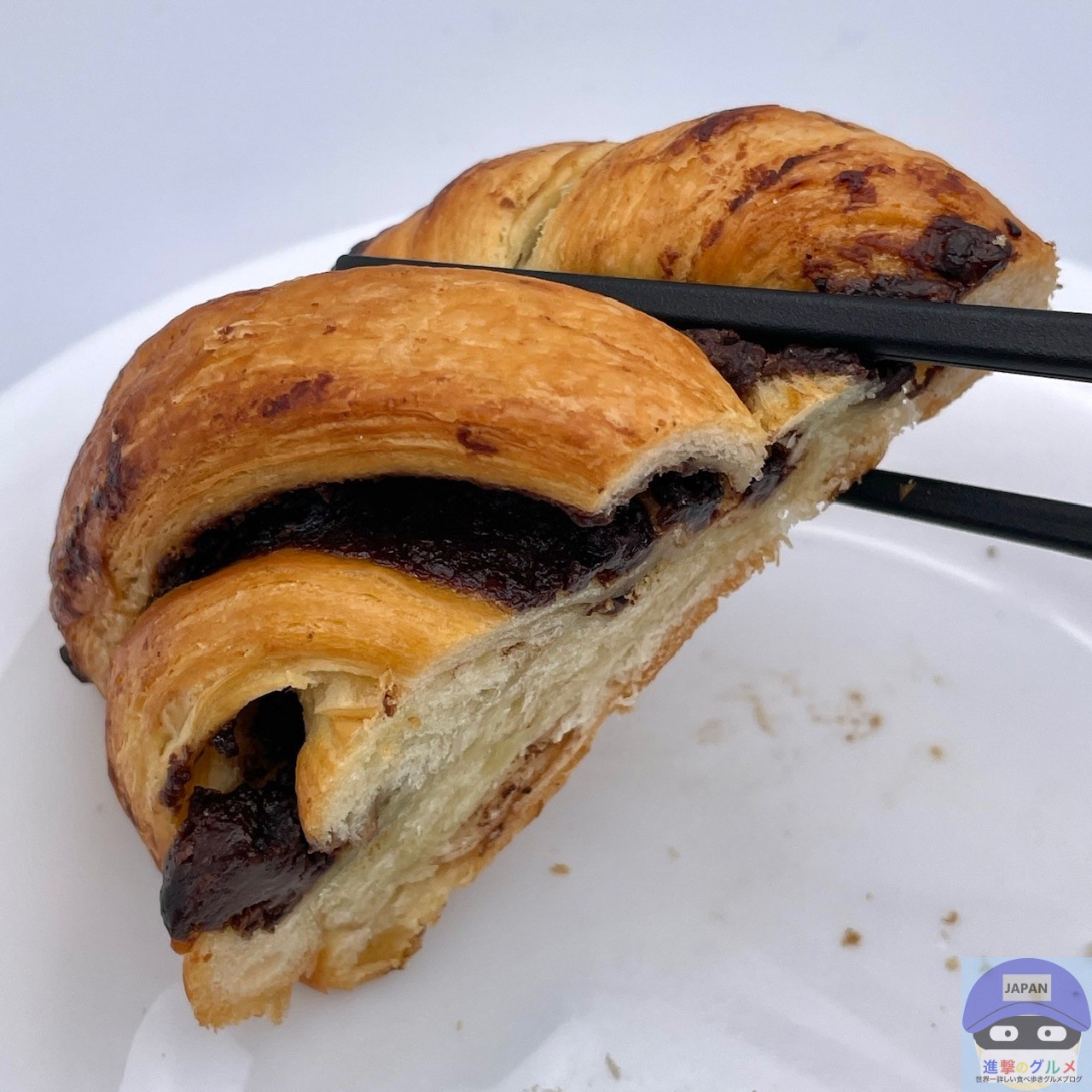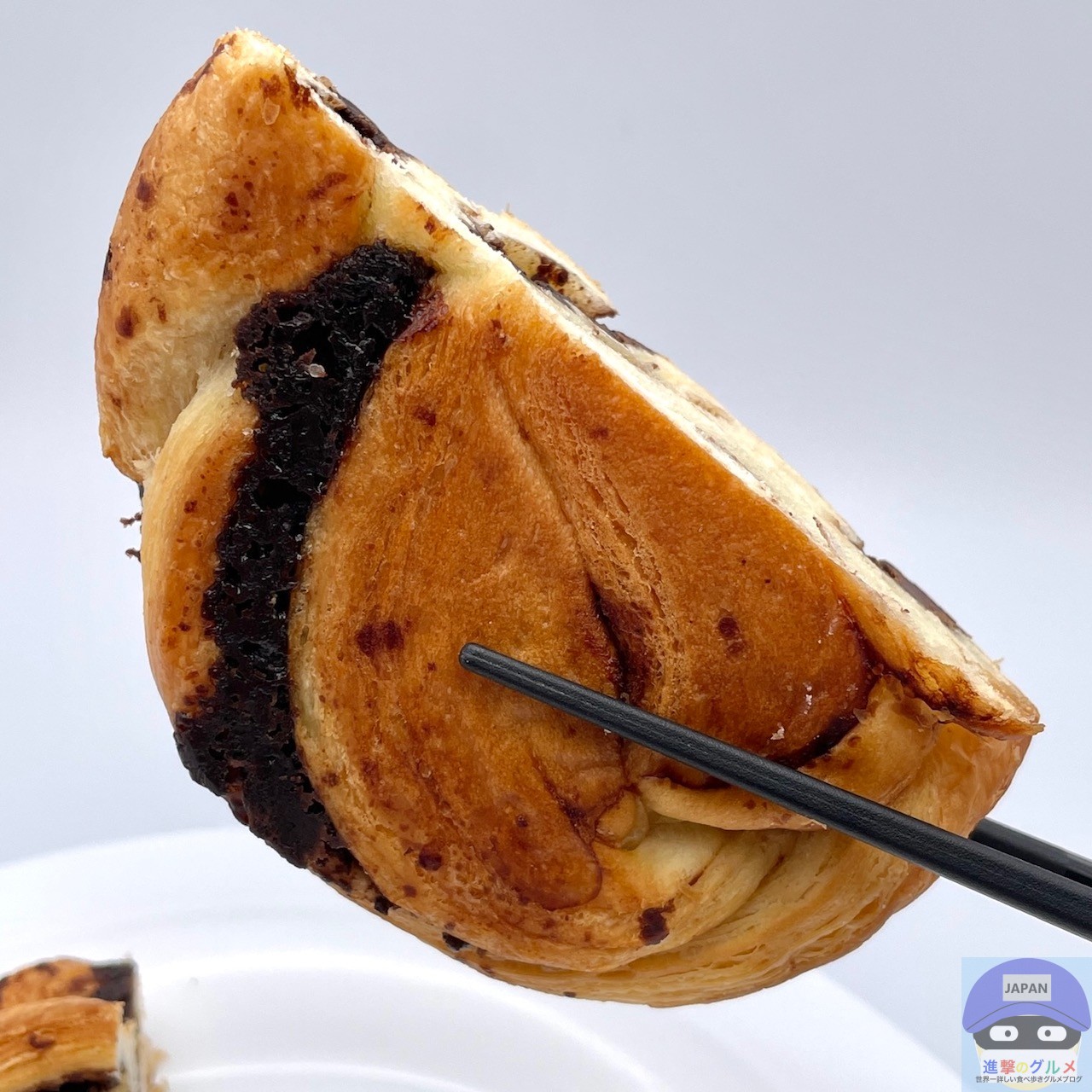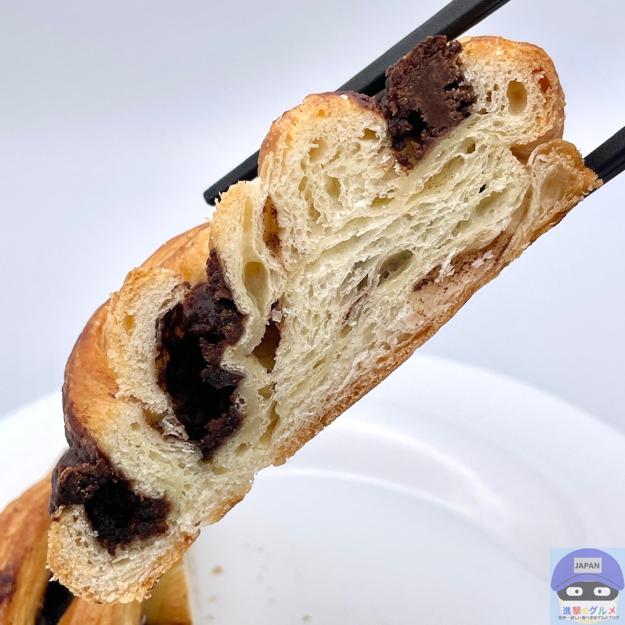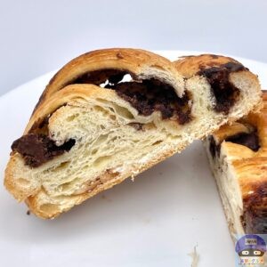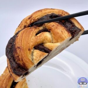 デニッシュ生地に、たっぷりのチョコレートフィリングを挟んで焼き上げた魅力的な見た目、チョコの良い香りがします。