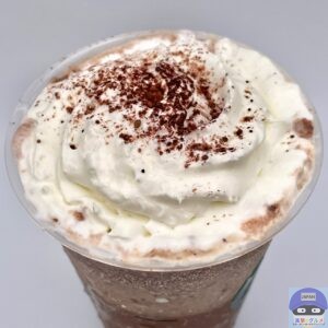 コーヒー・ミルク・ダークチョコレートパウダー・増量チョコレートチップ・エスプレッソショット・氷・ホイップクリームなどで作られています。