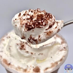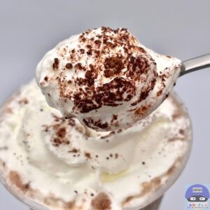 チョコレートチップの少しカリッと食感、氷のシャリッと食感を一層感じ、ホイップクリームも合わさり、クリーミーで甘さ控えめの味わいがクセになります。
