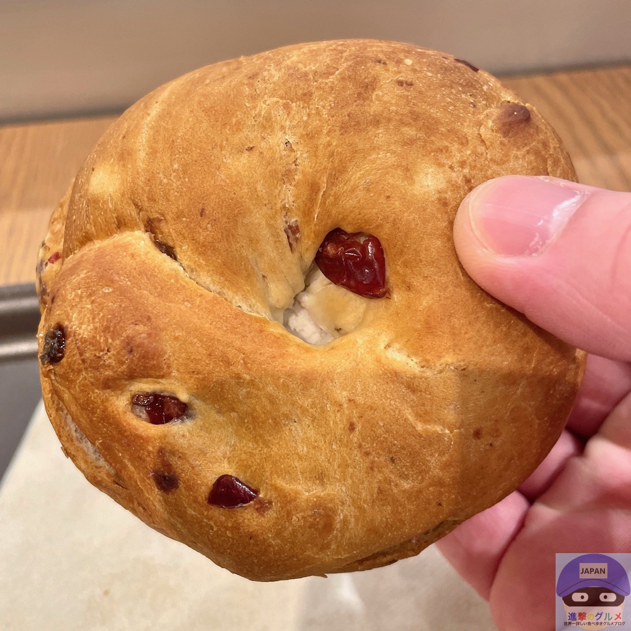 ひんやりして、もっちり少し硬めのベーグル生地に、じゅわっとしたストロベリーとクランベリーの食感と甘酸っぱさを感じます。