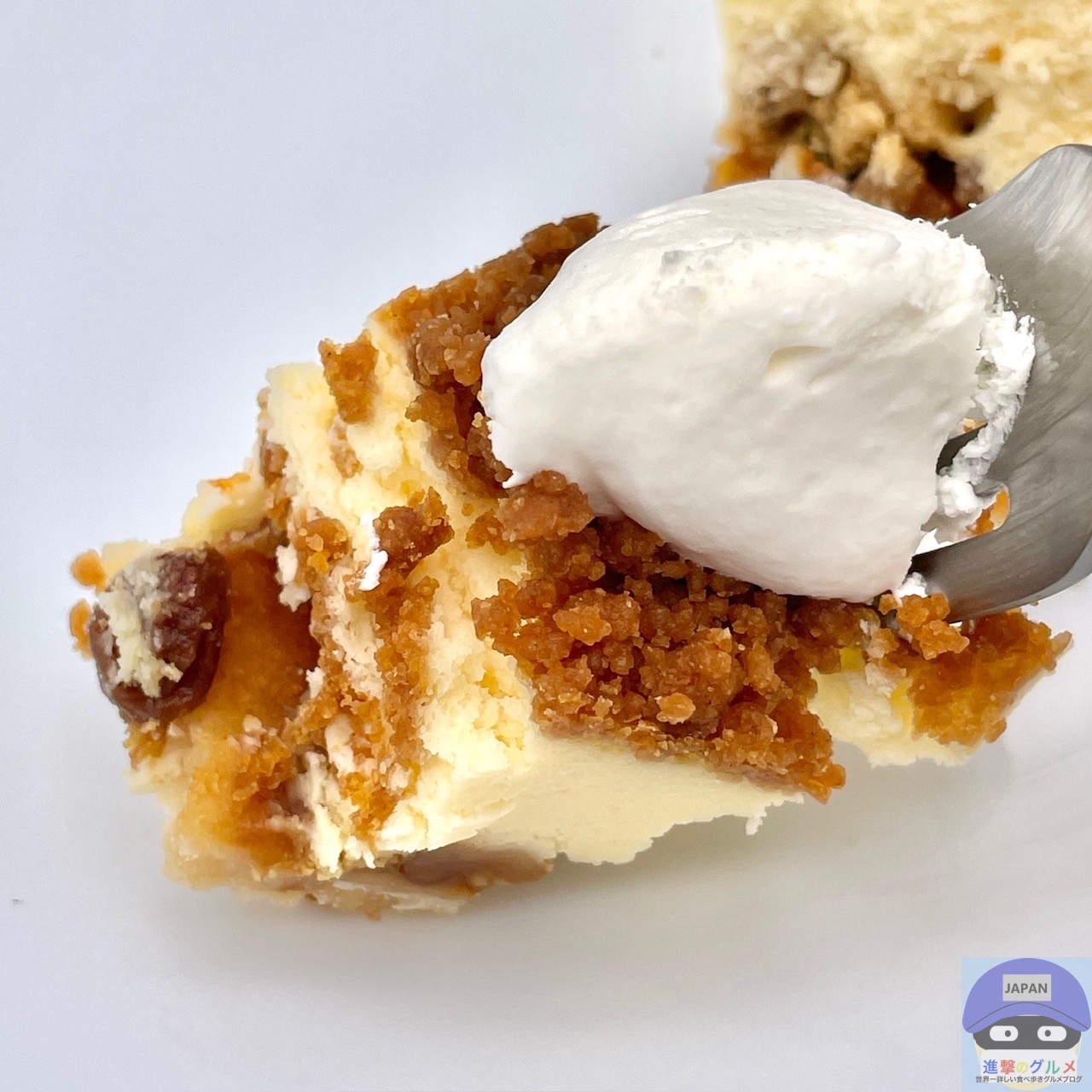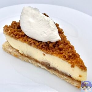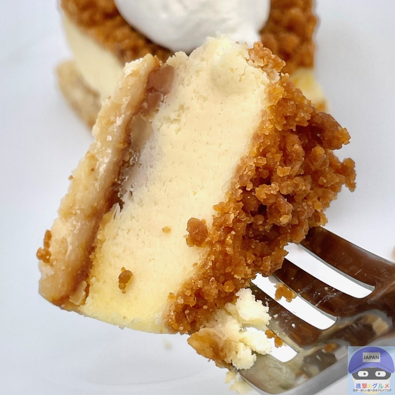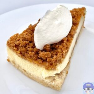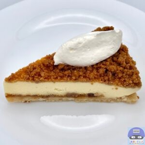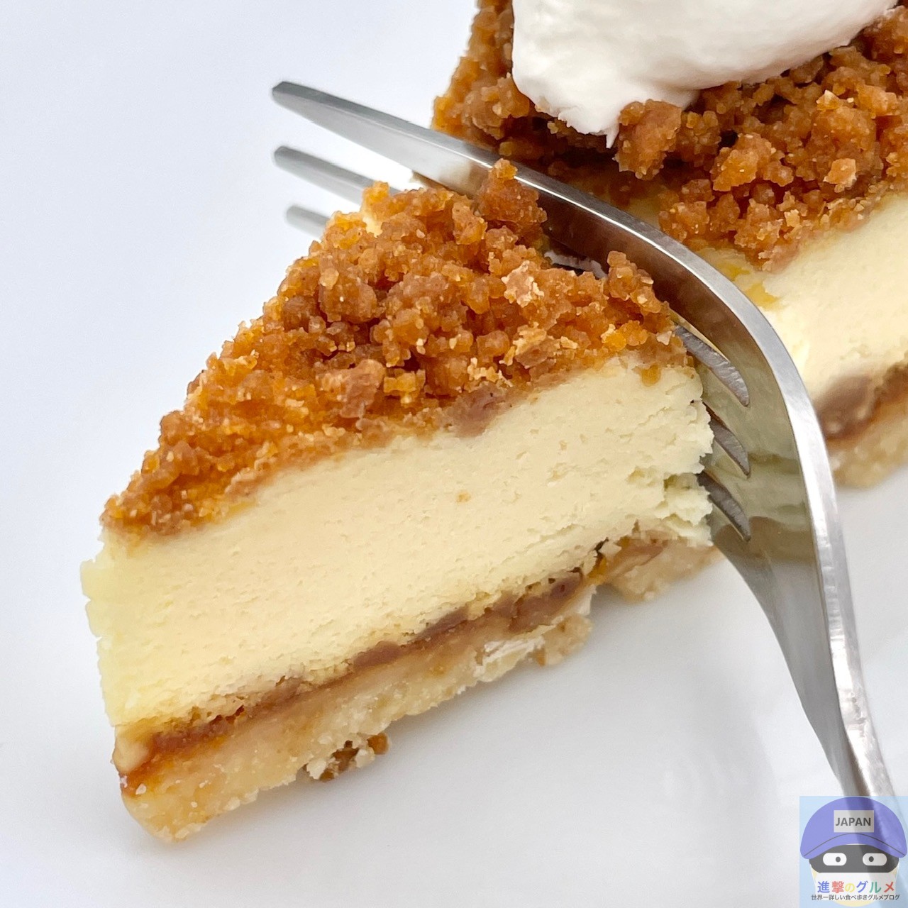 土台のクランブルのザクザク食感、トッピングのクランブルのしっとり食感とスパイスの風味、チーズケーキのなめらかさとコクのある旨みが良いです。