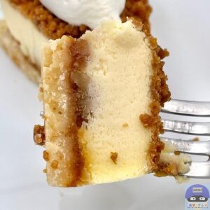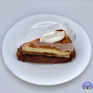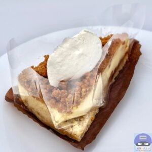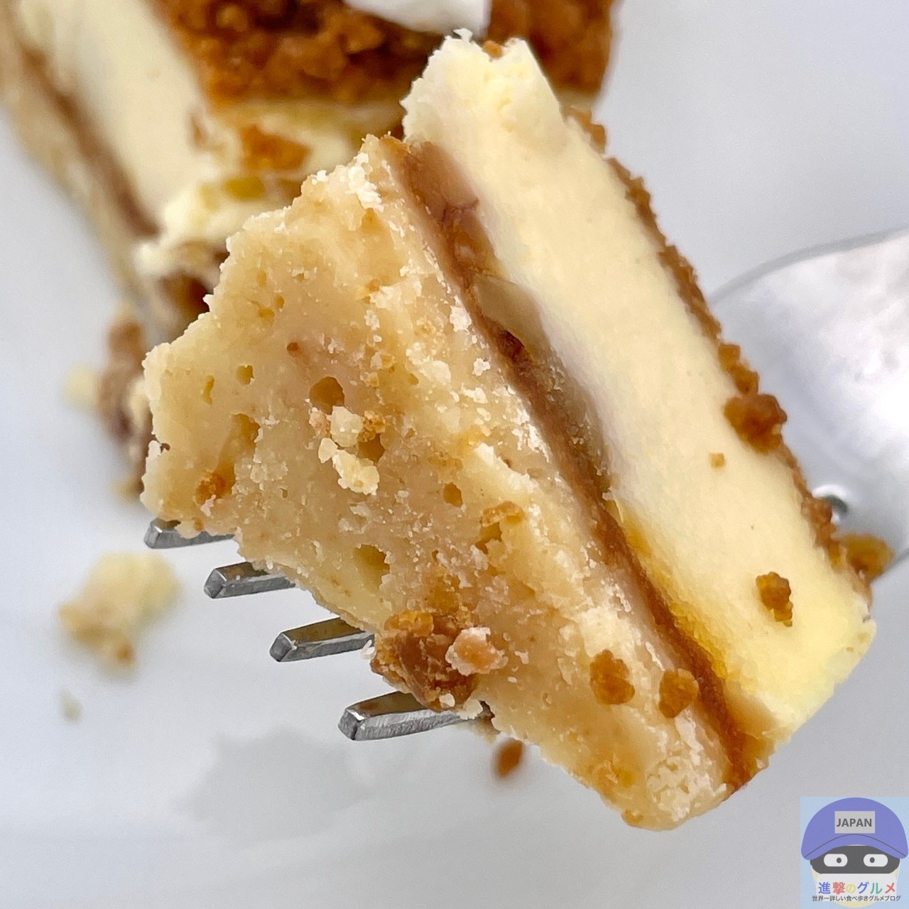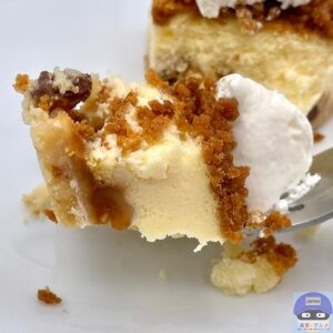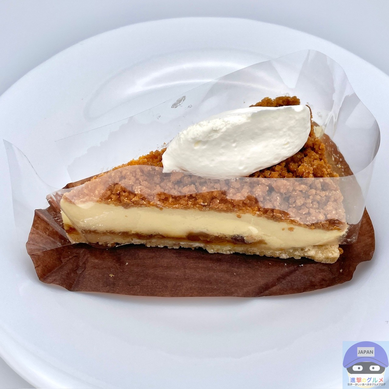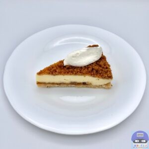 土台のクランブルのザクザク食感、トッピングのクランブルのしっとり食感とスパイスの風味、チーズケーキのなめらかさとコクのある旨みが良いです。
