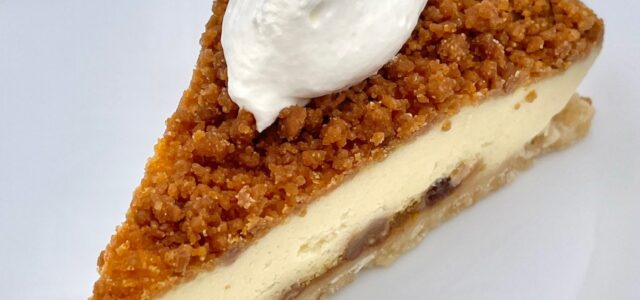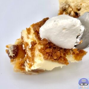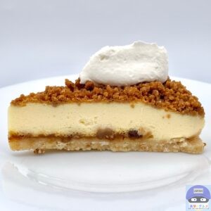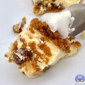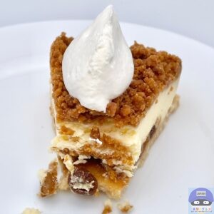 チーズケーキ、ナッツ、レーズン、キャラメルフィリング、クランブル(土台)、スパイス入りクランブル(トッピング)、ホイップクリームなどで作られています。
