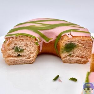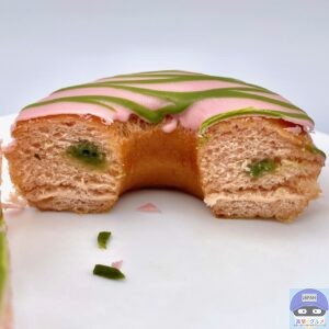 程よいくちどけ、抹茶クリームと抹茶チョコソースの抹茶の風味に、ほんのり塩気ある桜の風味で春らしいドーナツです。