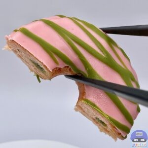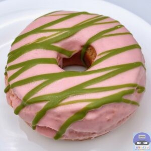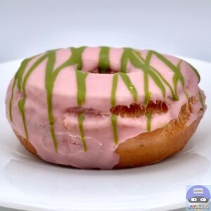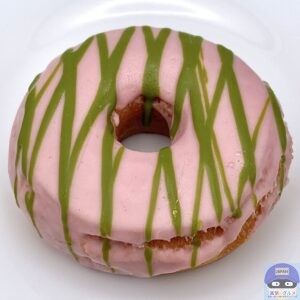 シュガードーナツ生地にさくらコーティングをし、抹茶チョコソースをトッピングしています。