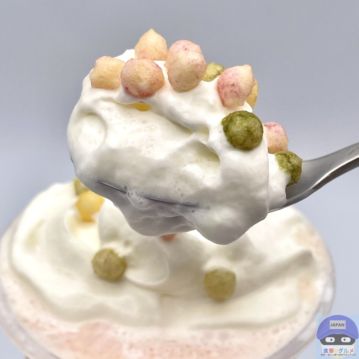 白桃ジュレ・ミルクプリン・桜ソース・氷などを使用した白桃ベースに、ホイップクリームとおいり風3色あられをトッピングしています。