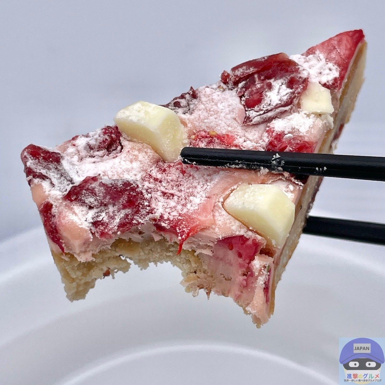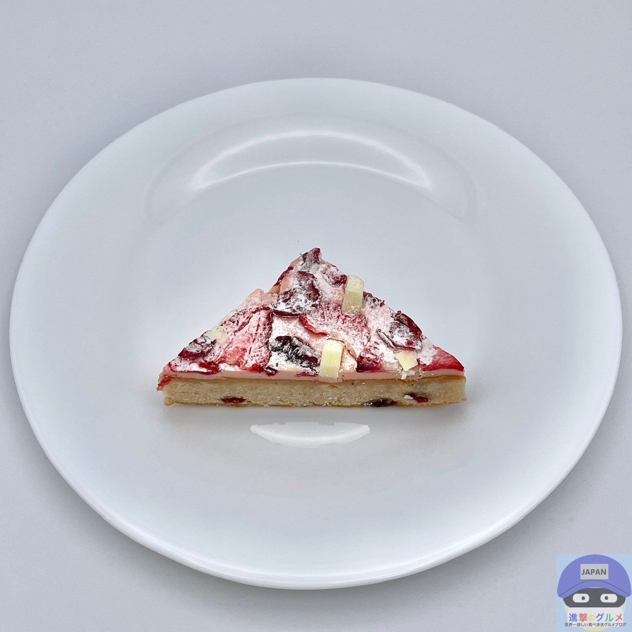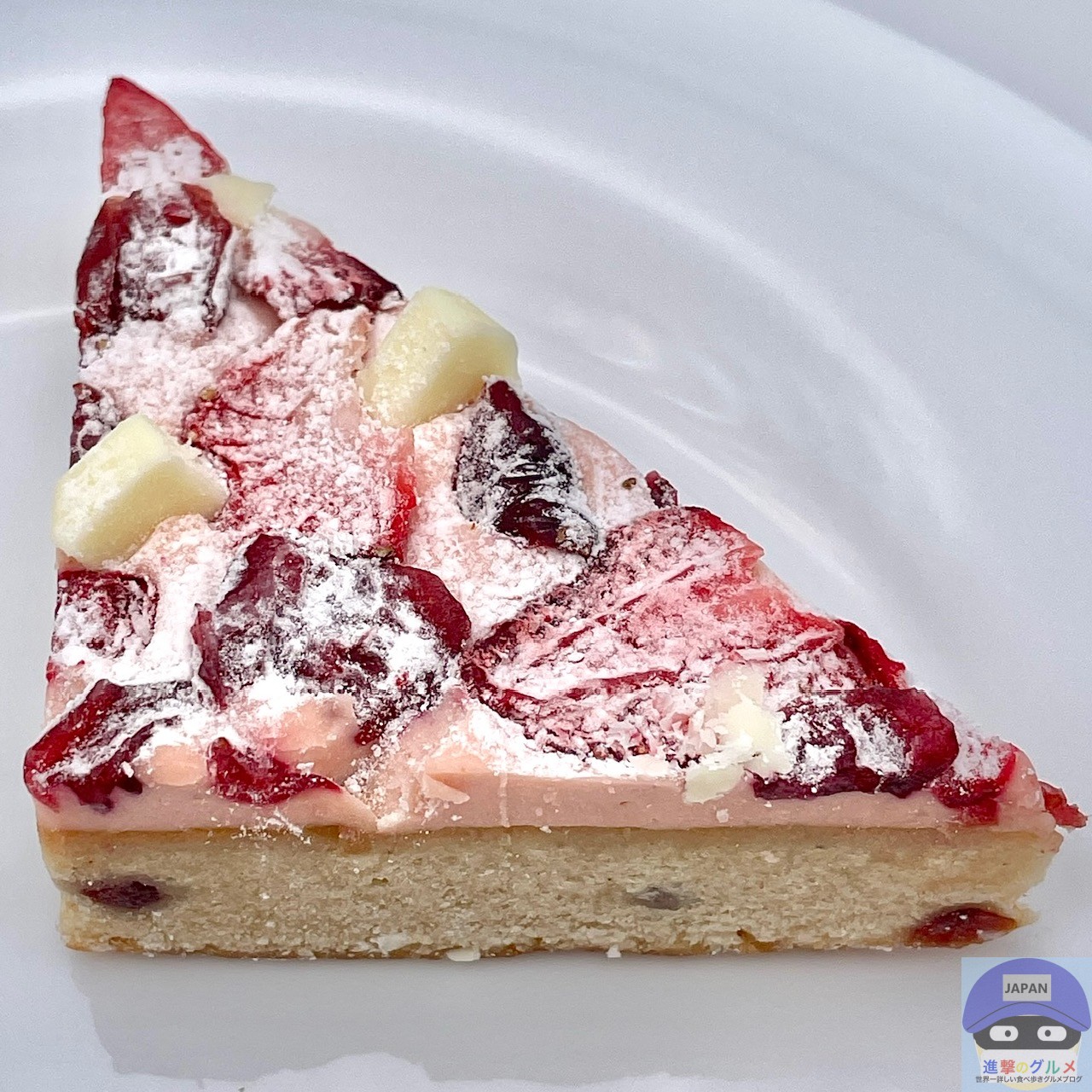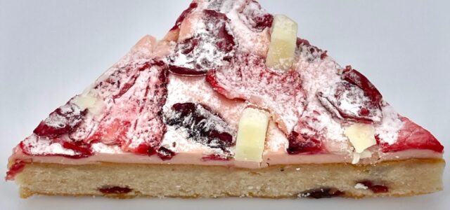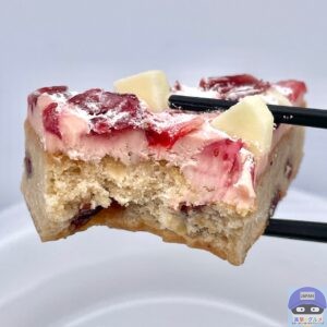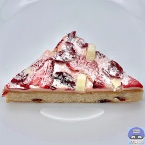 ベリーが入った、シナモンなどスパイス香る生地にストロベリークリームチーズフィリングを重ね、ストロベリー・クランベリー・ホワイトチョコレートチャンクなどをトッピングした焼菓子です。