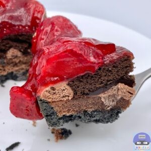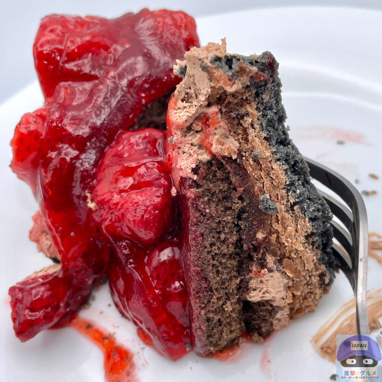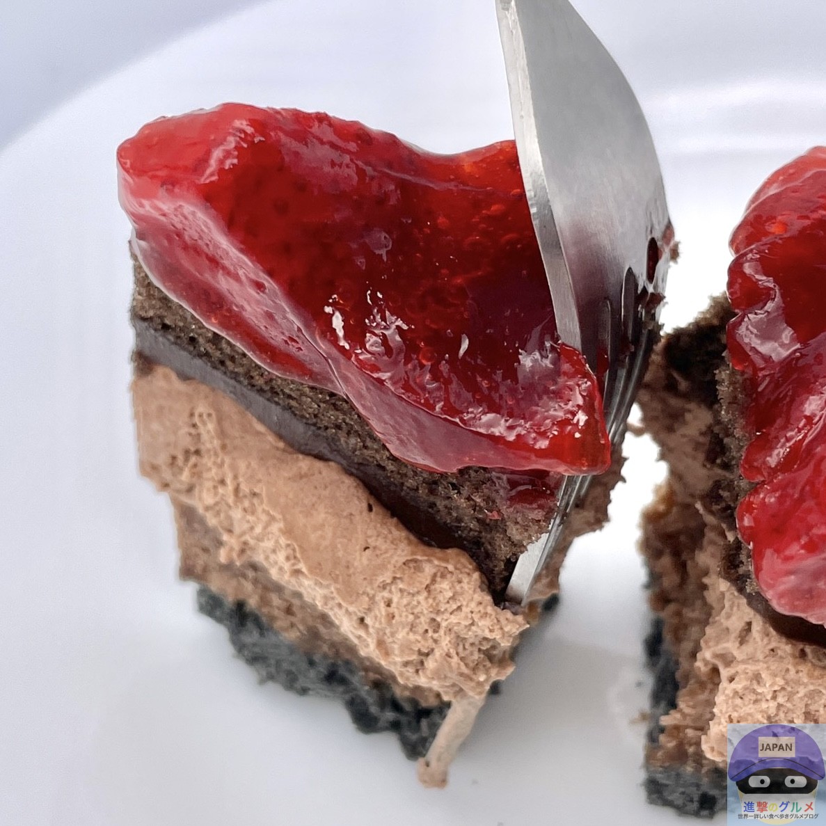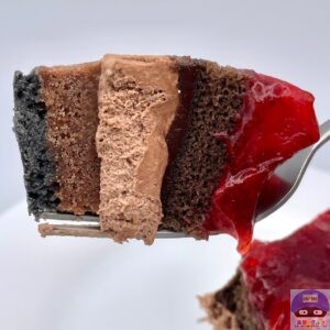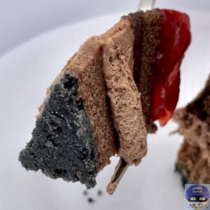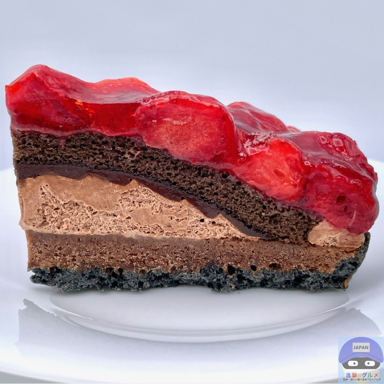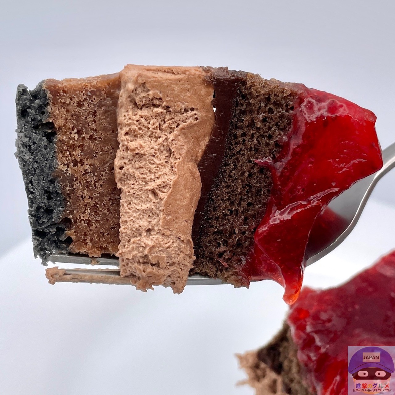 ブラックタルト生地とチョコレートタルトクリーム生地が合わさってしっとり食感、チョコレートホイップクリームとチョコレートガナッシュのコクのあるチョコ感、ココアスポンジのふんわり感があります。