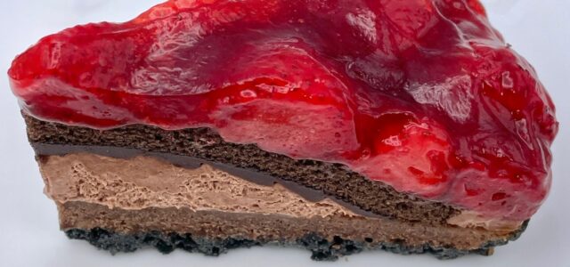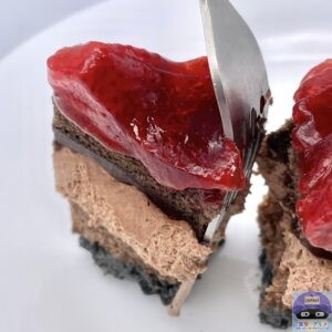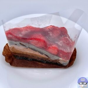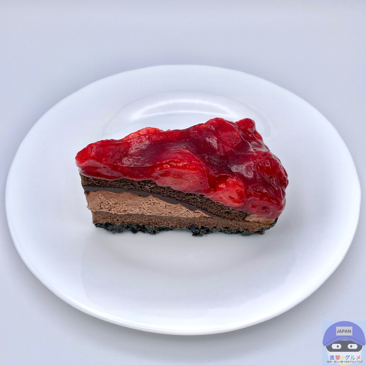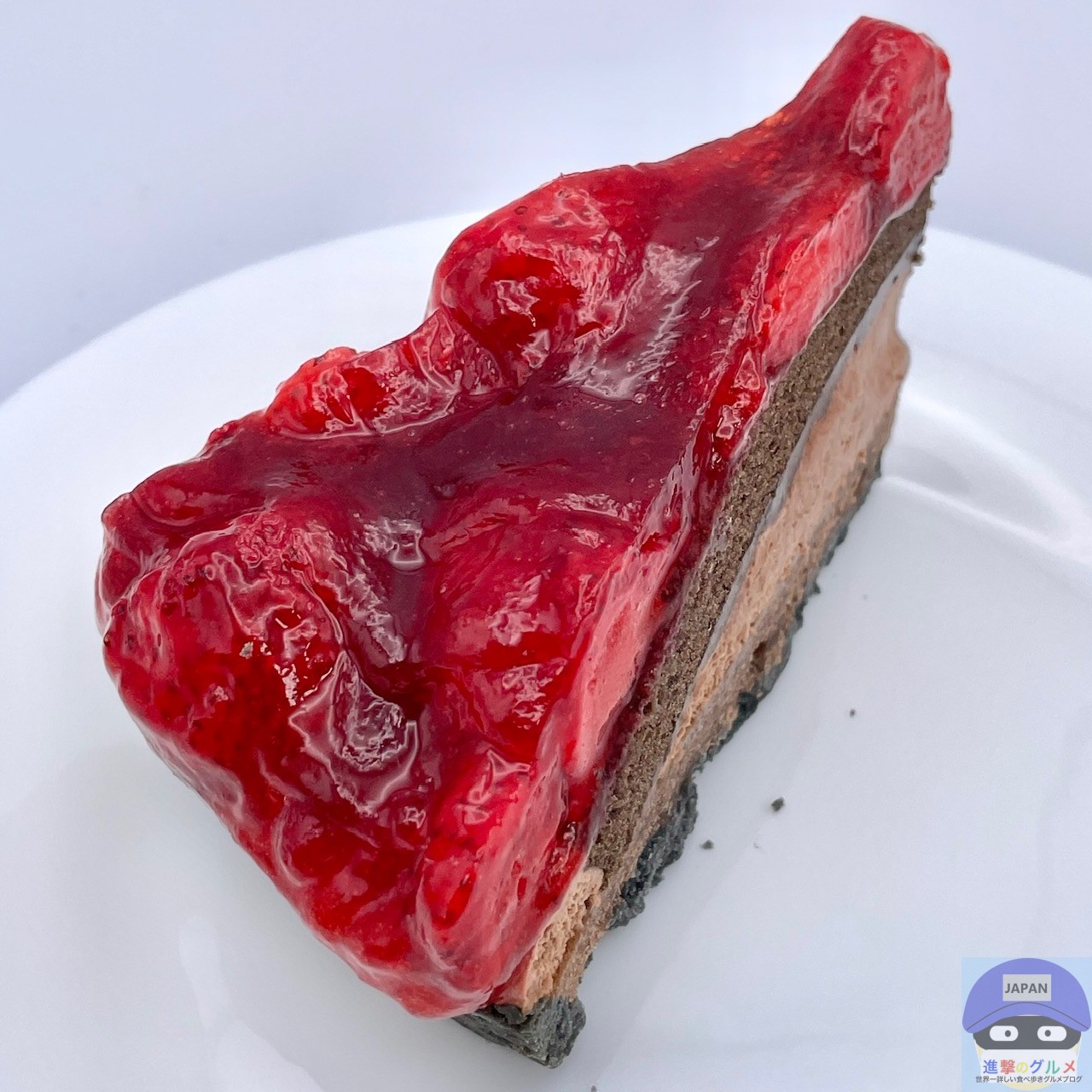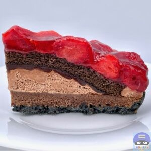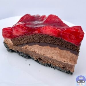 ブラックタルト生地に、チョコレートタルトクリーム生地、チョコレートホイップクリーム、チョコレートガナッシュ、ココアスポンジを重ね、大粒のストロベリー果肉入りベリージャムをのせています。