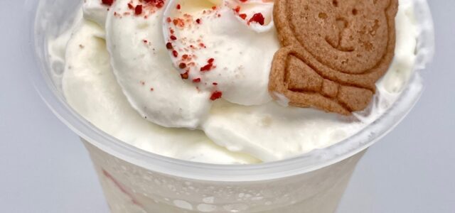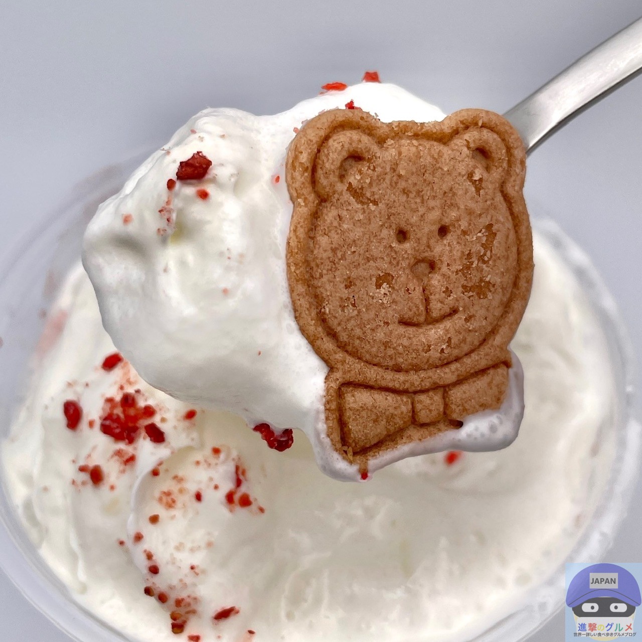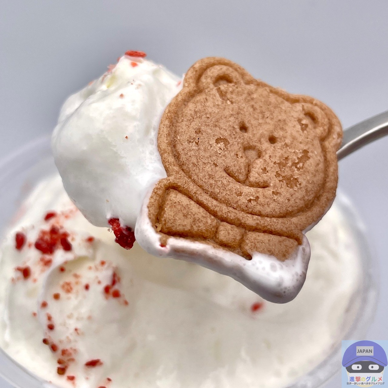ふんわり軽やか、すっと溶けてさっぱり、サクッと香ばしいクッキーの甘みが相性よく、フリーズドライの苺のほんのり甘酸っぱさがアクセントです。