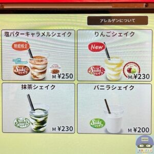 塩バターキャラメルシェイク、りんごシェイク、抹茶シェイク、バニラシェイクがあります。