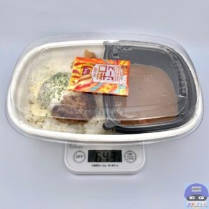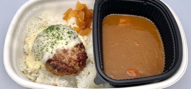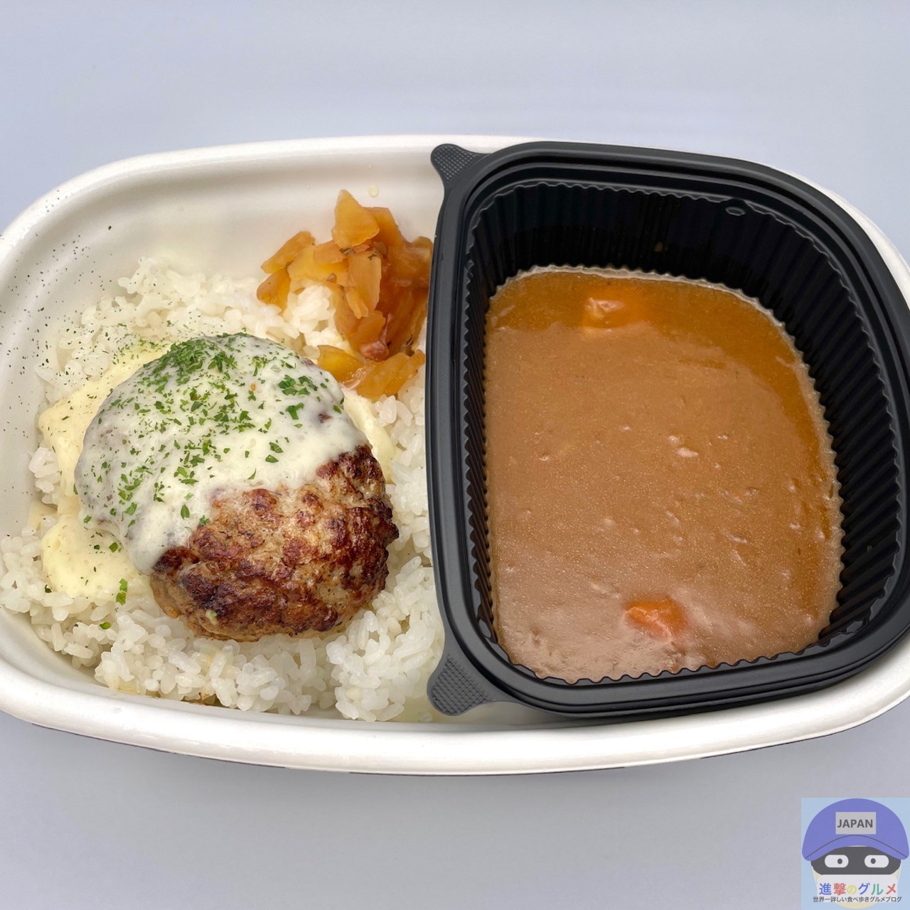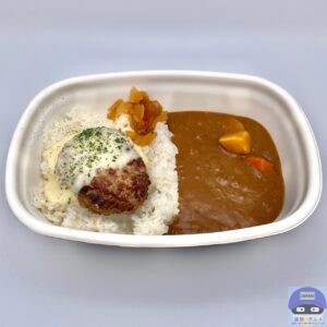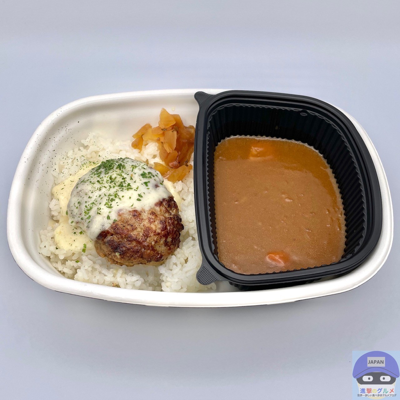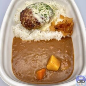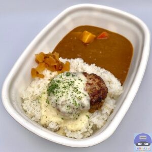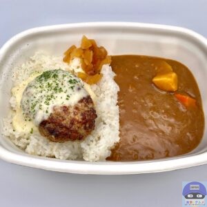 カレーライス、チーズインハンバーグ、ホワイトソース、福神漬けの組み合わせです。