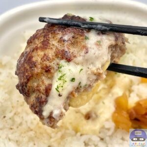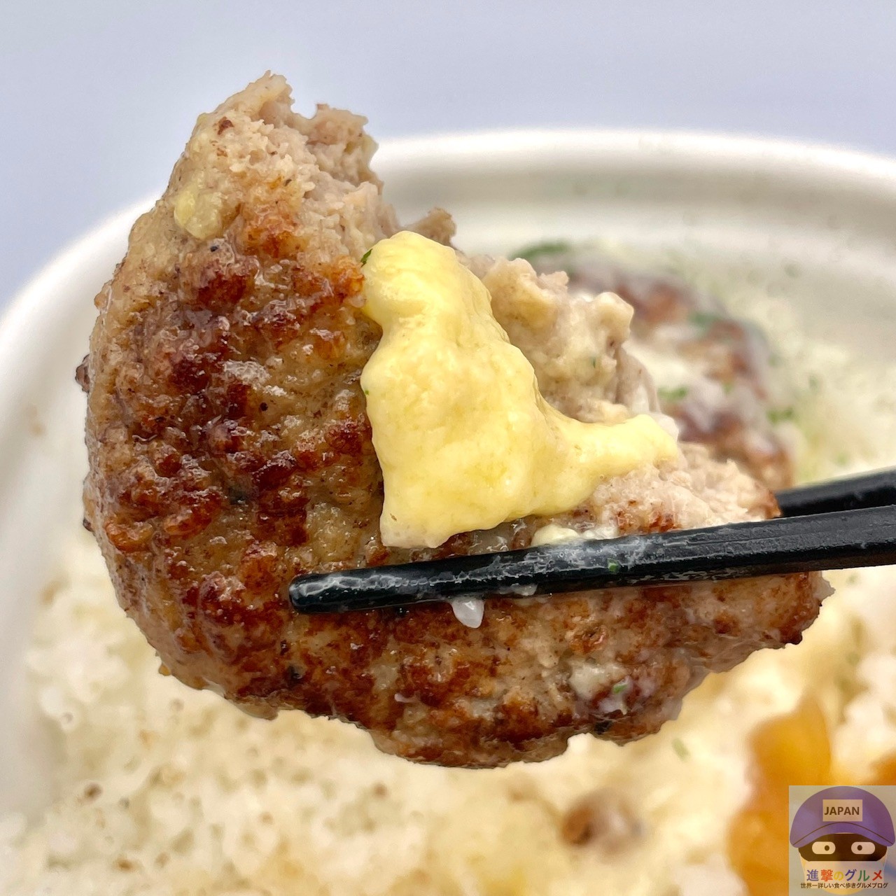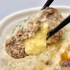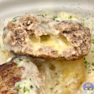 牛と豚の合い挽き肉を使ったハンバーグは厚みがあってジューシーな食感、ハンバーグを割ると、中からチーズがとろけ出てきます。