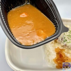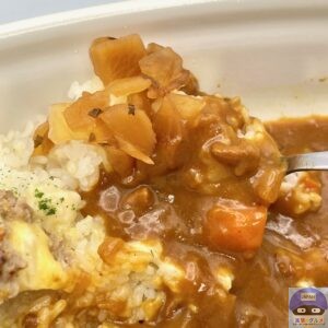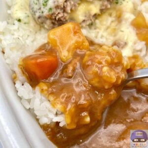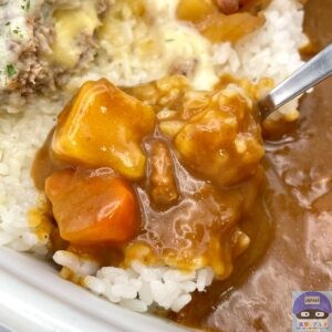 具材はじゃがいも・にんじん・細かいお肉が入って、辛さは甘口です。