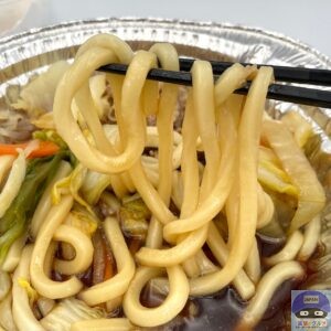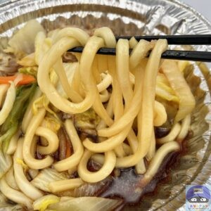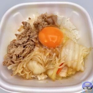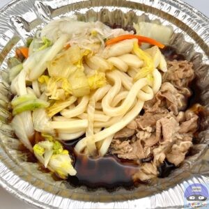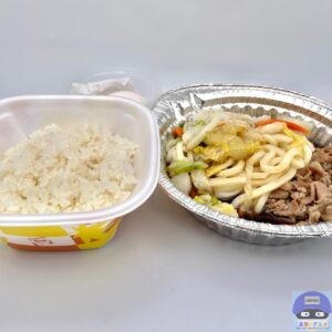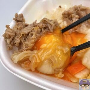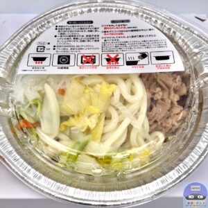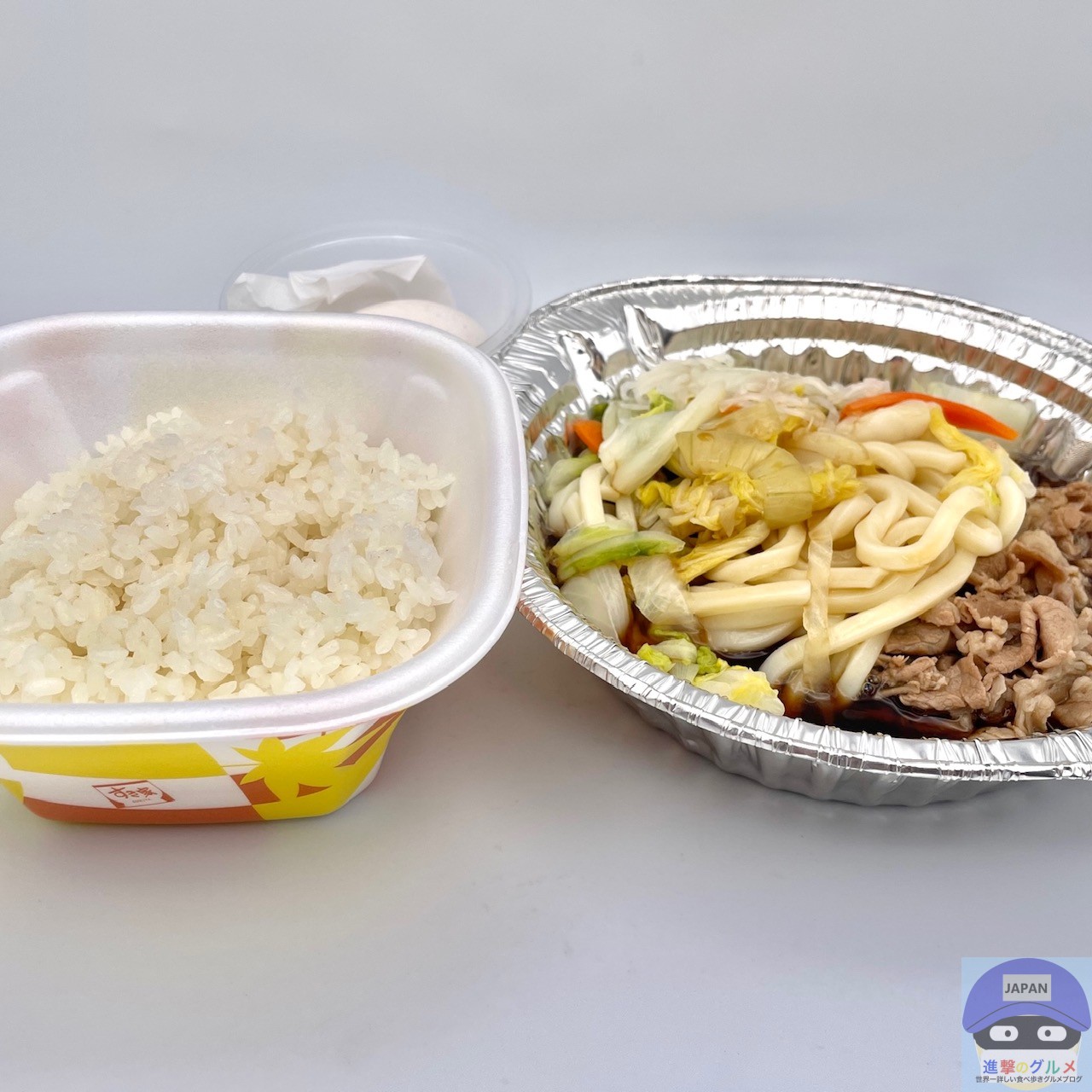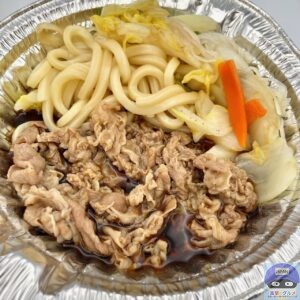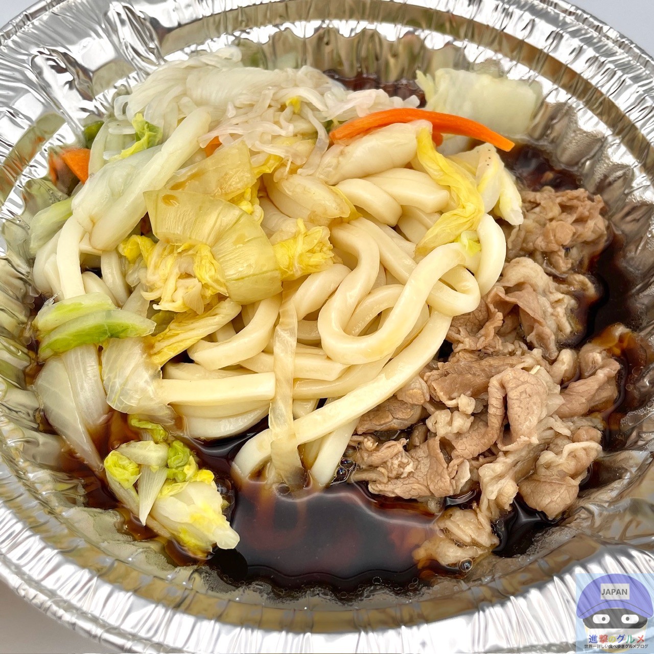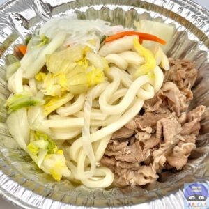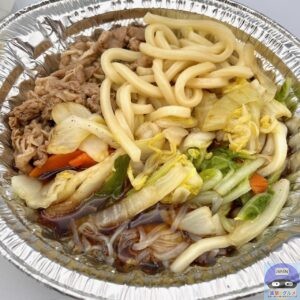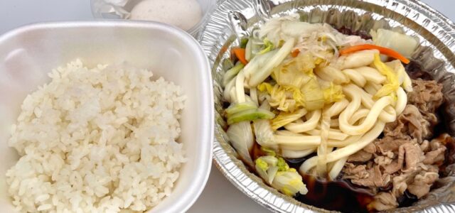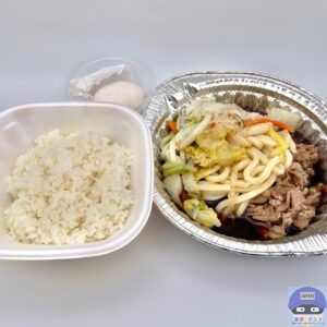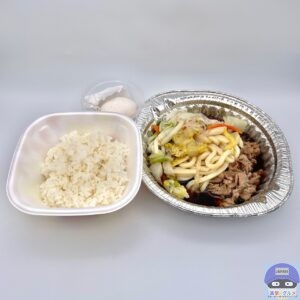 牛肉や1日の摂取目安の半量が摂れる野菜、うどんなどのたっぷり具材を堪能でき、セットにたまごが付いています。