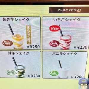 焼き芋シェイク、いちごシェイク、抹茶シェイク、バニラシェイクがあります。