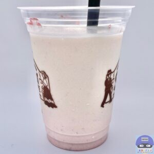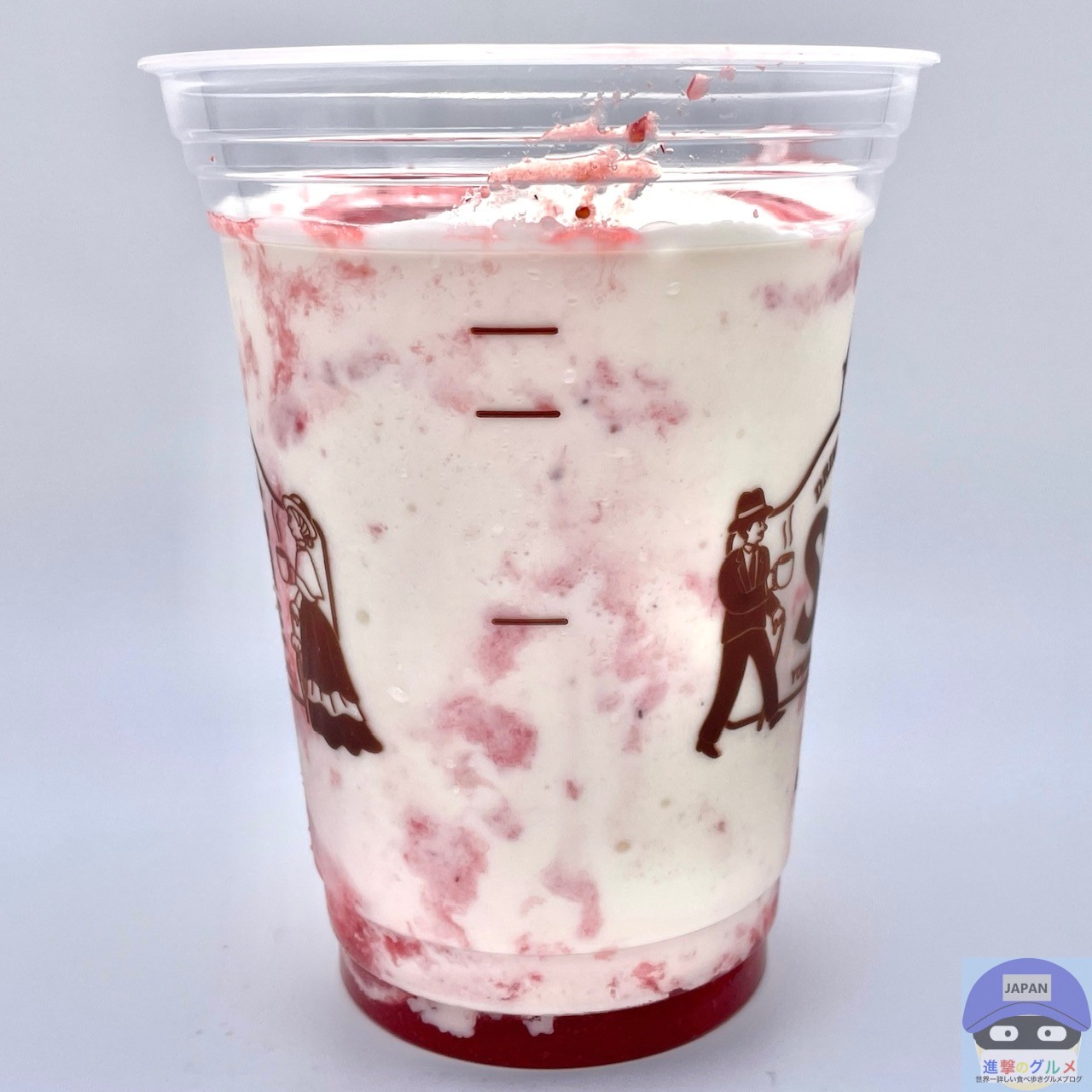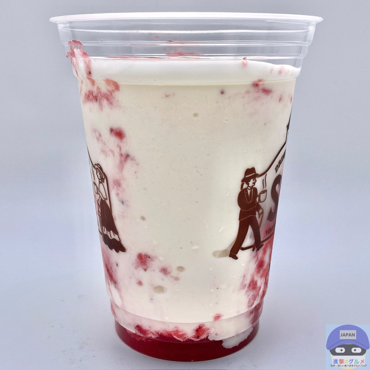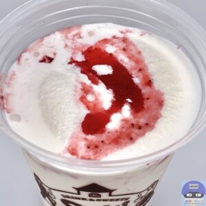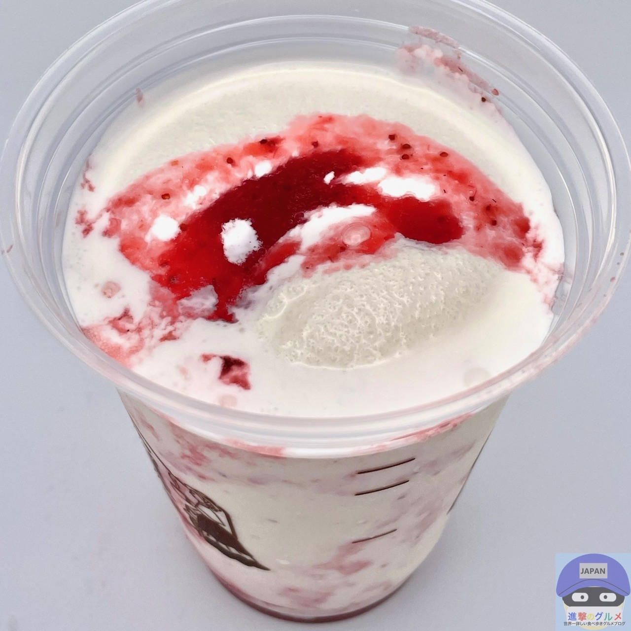 味が均一になり、バニラシェイクの甘みが主役でいちごの風味と甘酸っぱさがたまらない大満足のおいしさ、いちご果肉のつぶつぶ感が良いアクセントです。