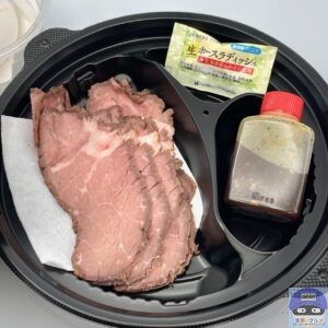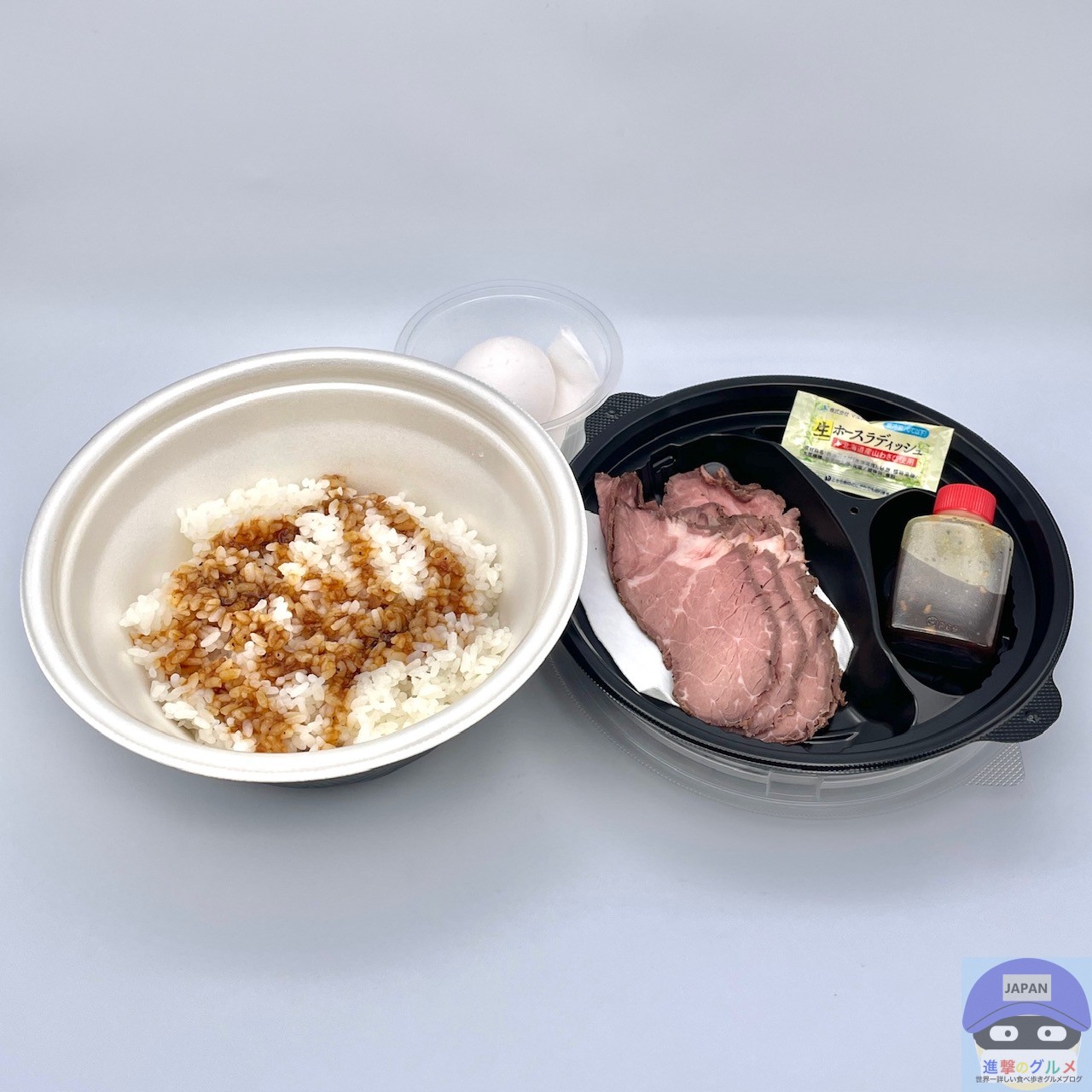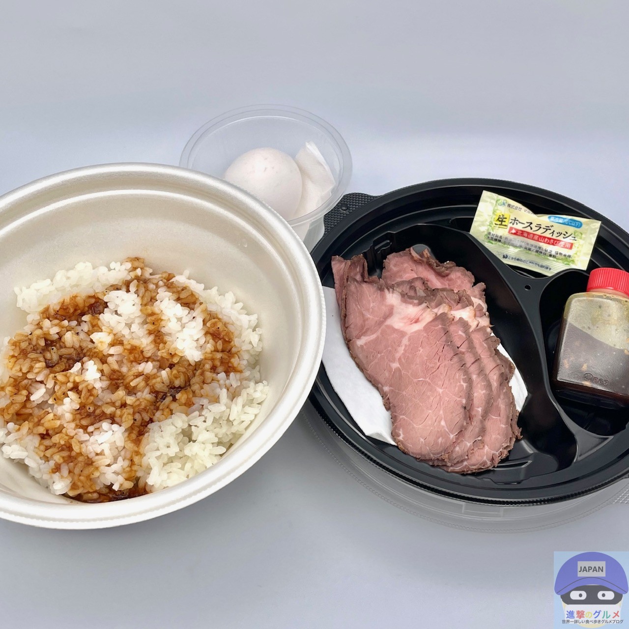 ローストビーフ(7切れ)、醤油ダレ、ホースラディッシュ、生たまご、醤油ダレのかかったごはんの組み合わせです。