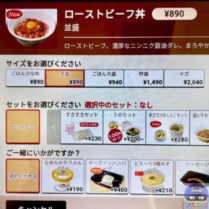 ローストビーフをたっぷり食べたい方には、ごはん大盛りに並盛の3倍の量のお肉をのせた“メガ”サイズも用意しています。
