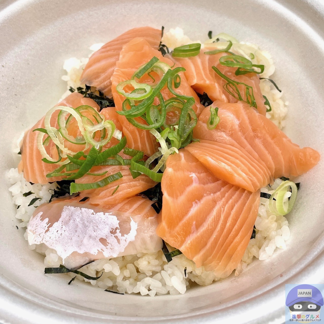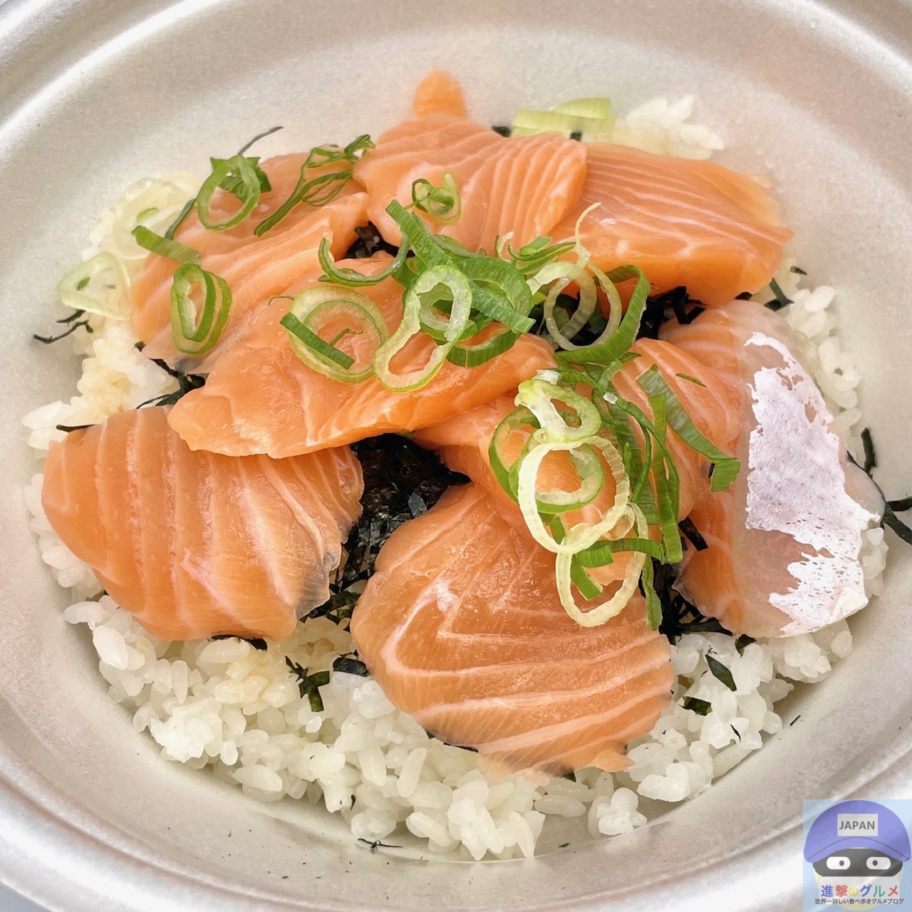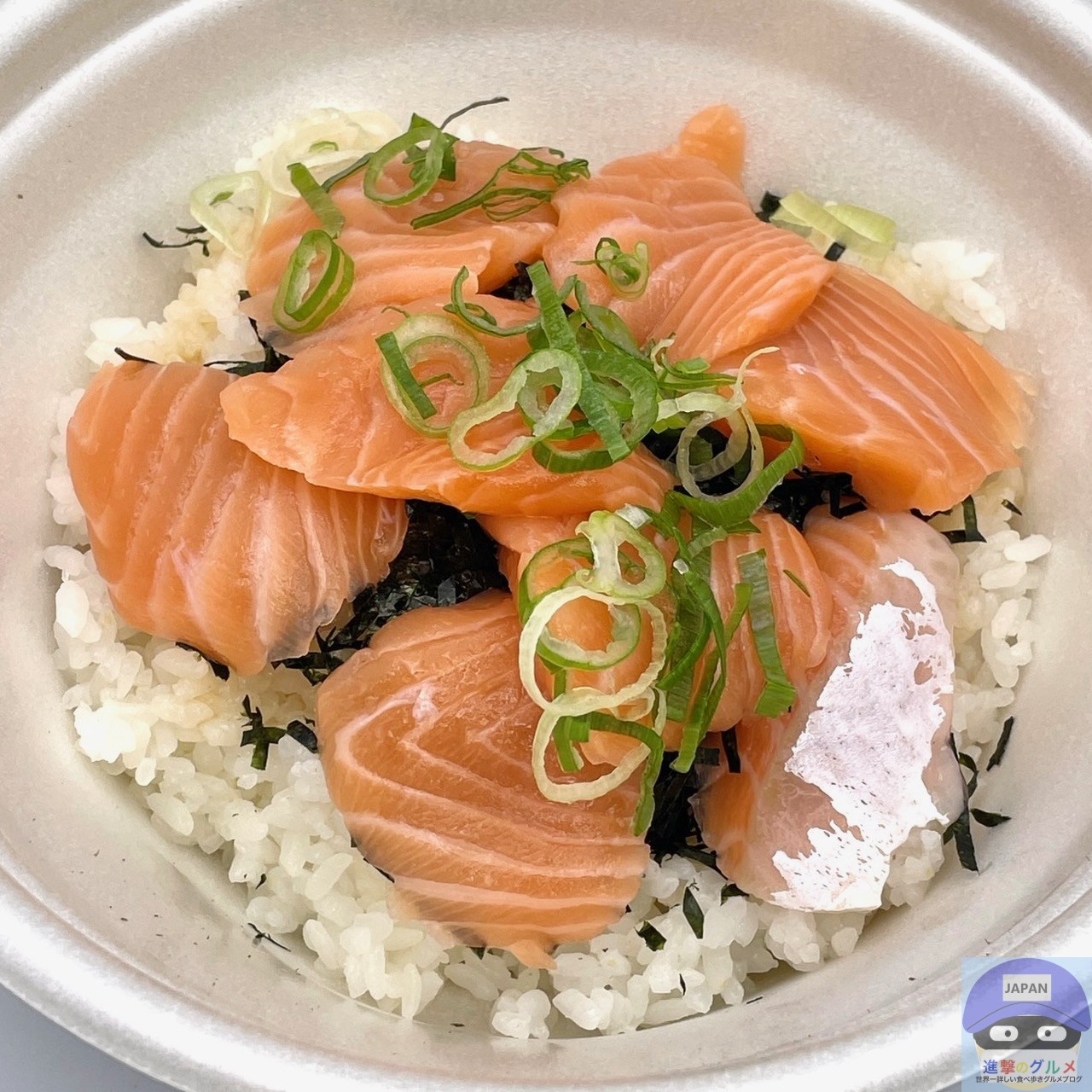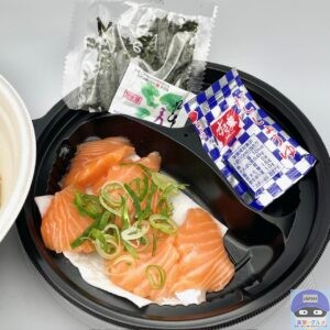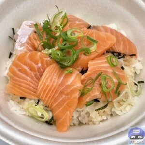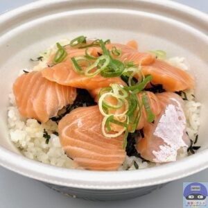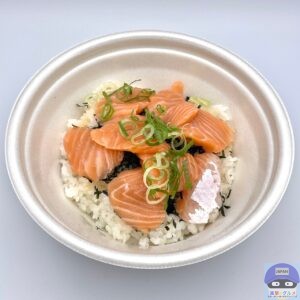 サーモン・青ねぎ・きざみ海苔・特製だれ・ごはんで作られています。