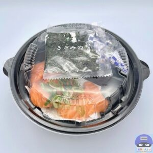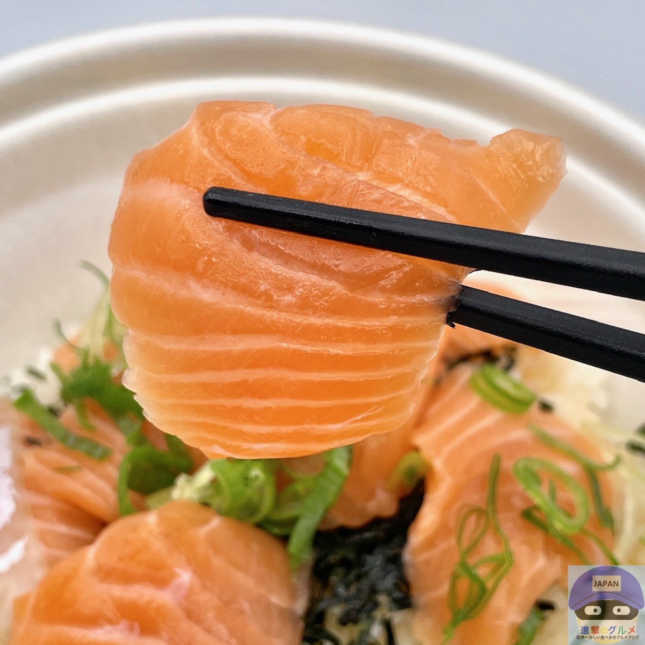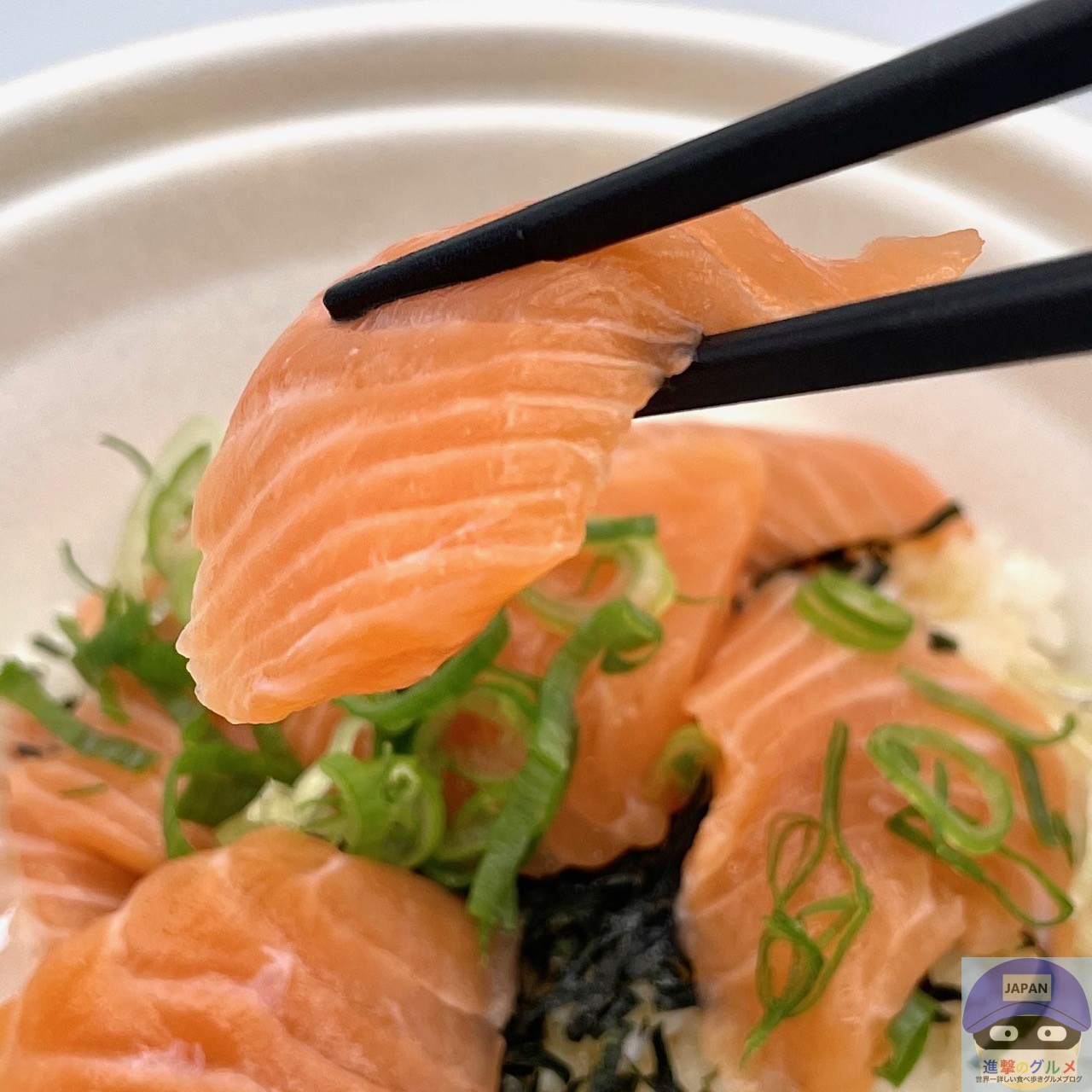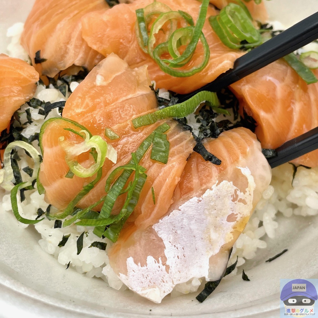 サーモン・青ねぎ・きざみ海苔・特製だれ・ごはんで作られています。