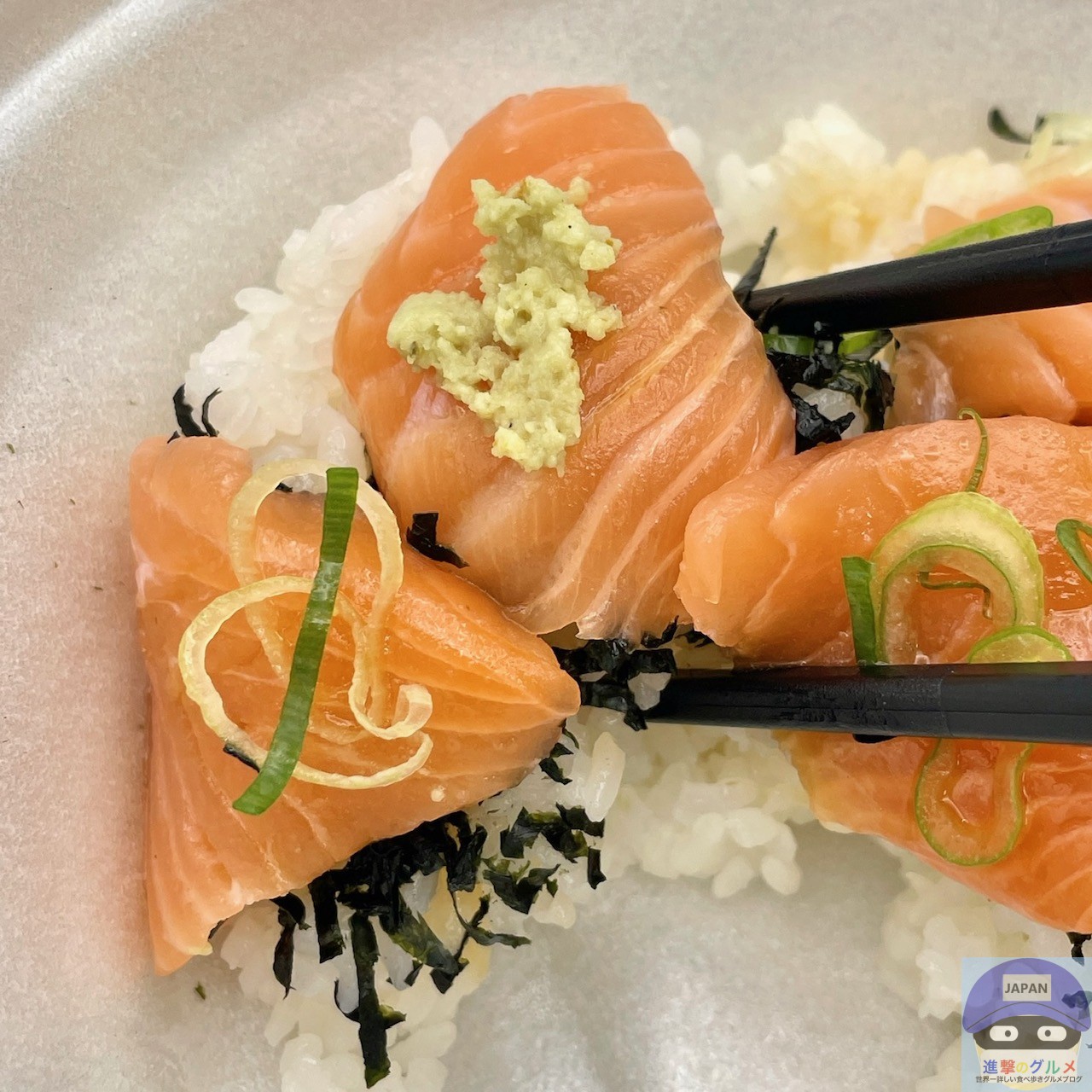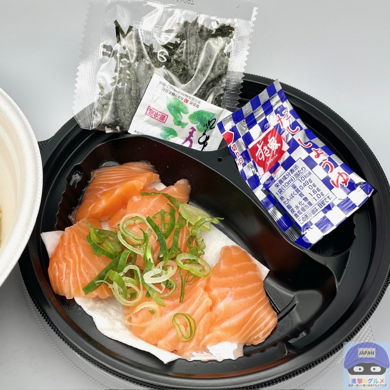 特製だれがかかったごはん、サーモン(8切れ)、青ねぎ、きざみ海苔、醤油、わさびの組み合わせです。