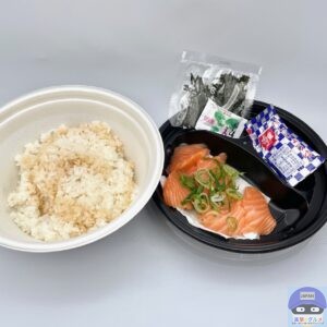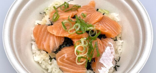脂のりの良いノルウェー産アトランティックサーモンの切り身を、国産米100%のごはんに盛りつけた商品です。