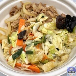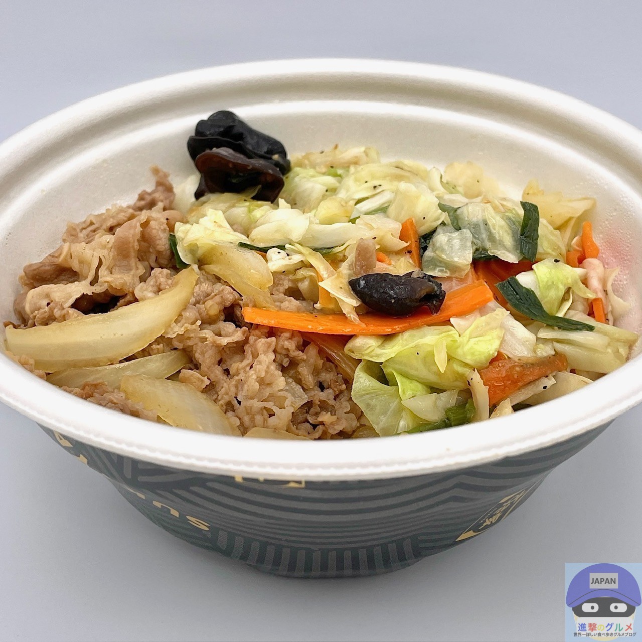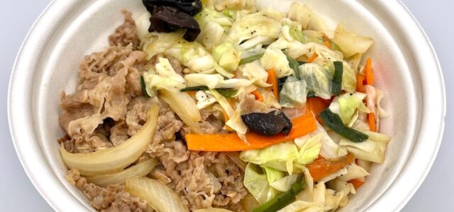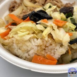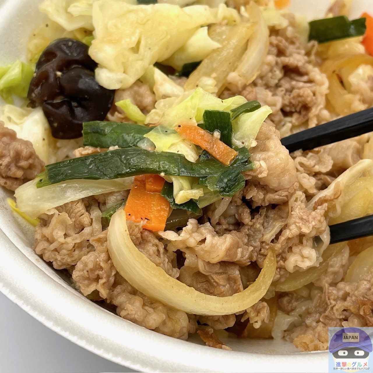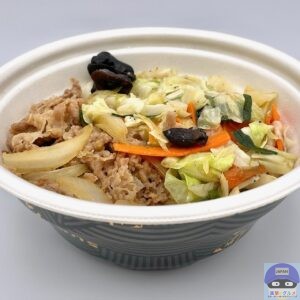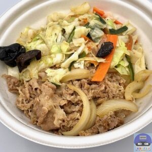 程よくやわらかい牛肉としんなりシャキッと玉ねぎで馴染みの味わいの牛丼に、野菜炒め風で食べごたえが増します。