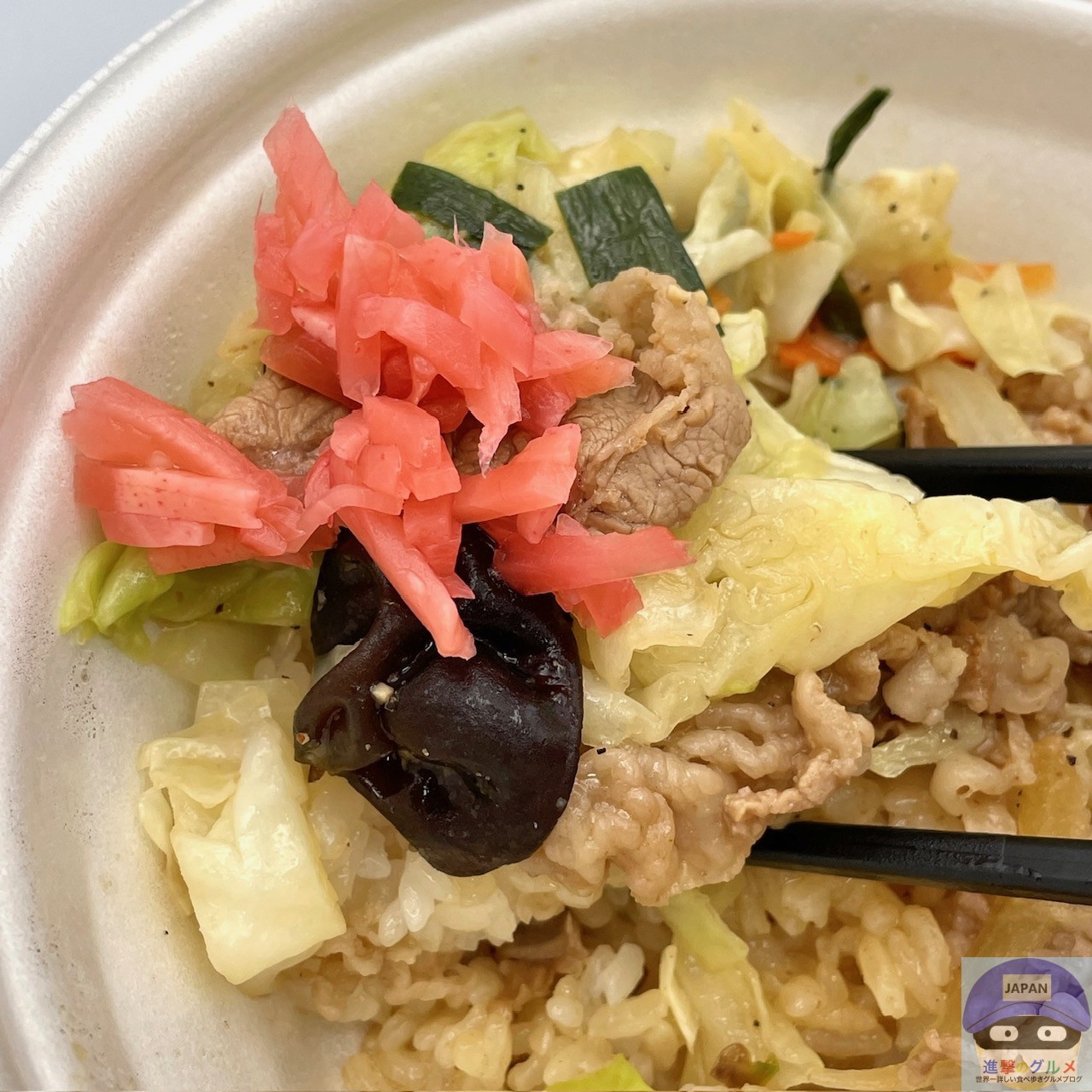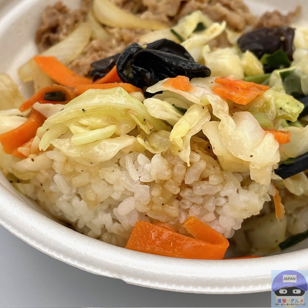 熱々のごはんに、シャキシャキ野菜の甘み、ごま油とブラックペッパーの効いた特製うま塩ダレの野菜炒め風で安定の美味しさです。