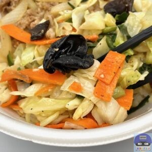 野菜炒め風の具材は、キャベツ・にんじん・にら・キクラゲなどが入っています。